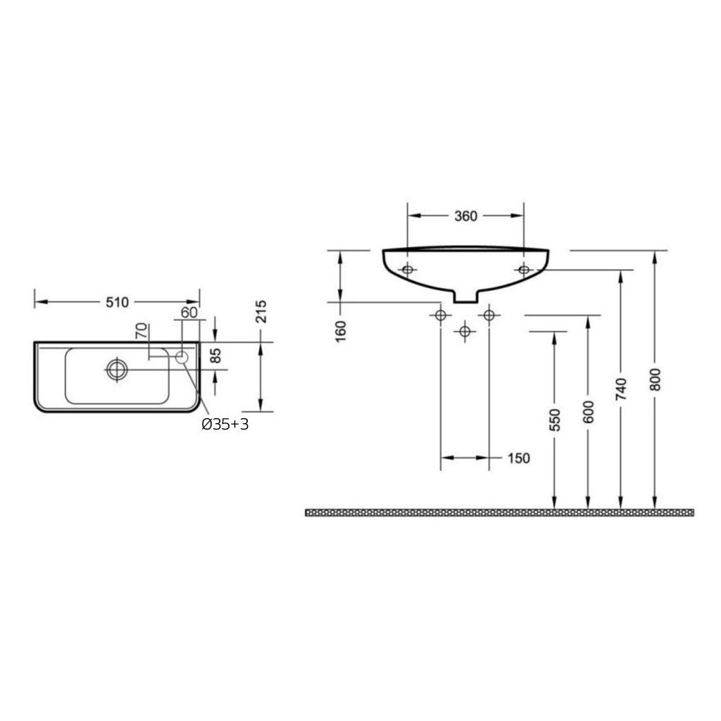 Kerámia mosdó jobb oldalon csapnyílással és túlfolyóval. Függesztett telepítési lehetőségek.A mosdókagylót rögzítőcsavarok nélkül szállítjuk.