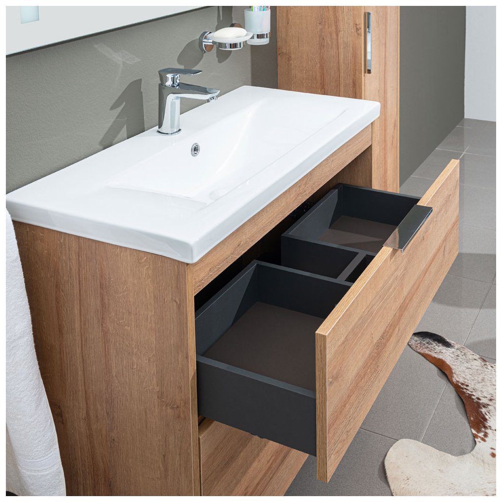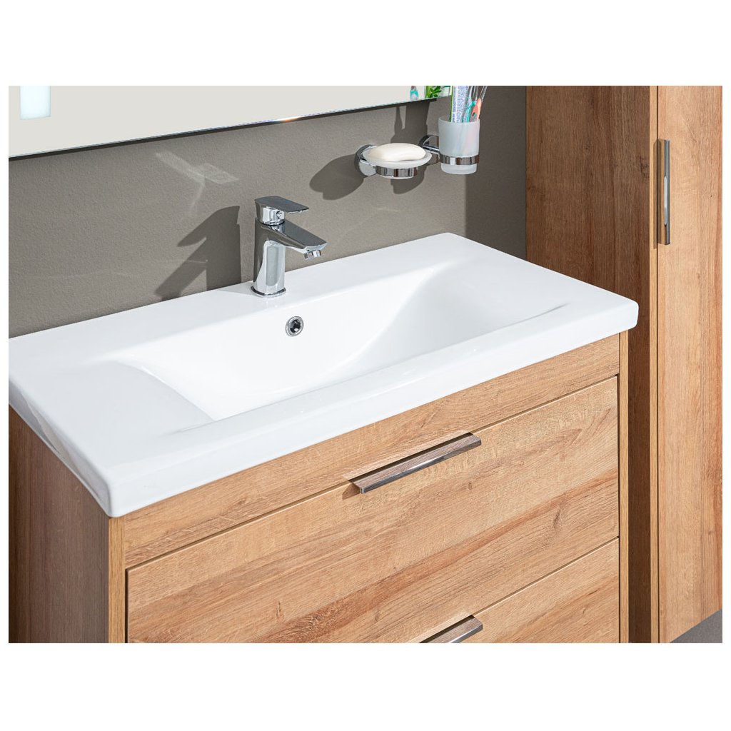 A Vigo fürdőszobabútor sorozat lehetővé teszi, hogy a szekrényeket sokféle változatban kombinálhassa. Így lehetséges a nagy fürdőszobák komplex kombinációi és a minimalista megoldások modern kialakítása. A fiókok dizájnos krómozott fogantyúkkal és márkás, lassú záródású futókkal vannak felszerelve. Két színkombináció közül választhat, fehér fényű, Riviera tölgy. A szekrények lézerrel vágott élekkel rendelkeznek, összeszerelve szállítjuk, és mindegyiket felakasztják.Bútorkerámia mosdókagyló egy furattal 38 mm élvastagságú állványkeverőhöz. Ezekkel a mosdókagylókkal kielégítik az Ön igényeit az egyszerű és egyben vonzó fürdőszobai felszerelések iránt, vonzó áron. Ezeknek a mosogatóknak az előnyei kétségtelenül funkcionalitásuk és vonzó megjelenésük. A mosogató bútorokhoz készült.