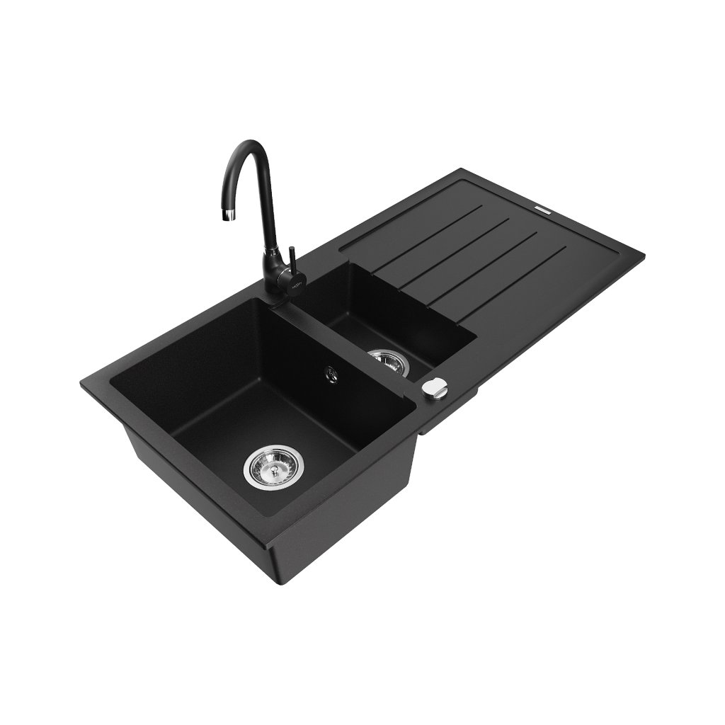 Mexen Andres 1,5 kamrás gránit konyhai mosogató csepptálcával 100x50 cm Telma konyhai csapteleppel, fekete, 6515-77-670200-70