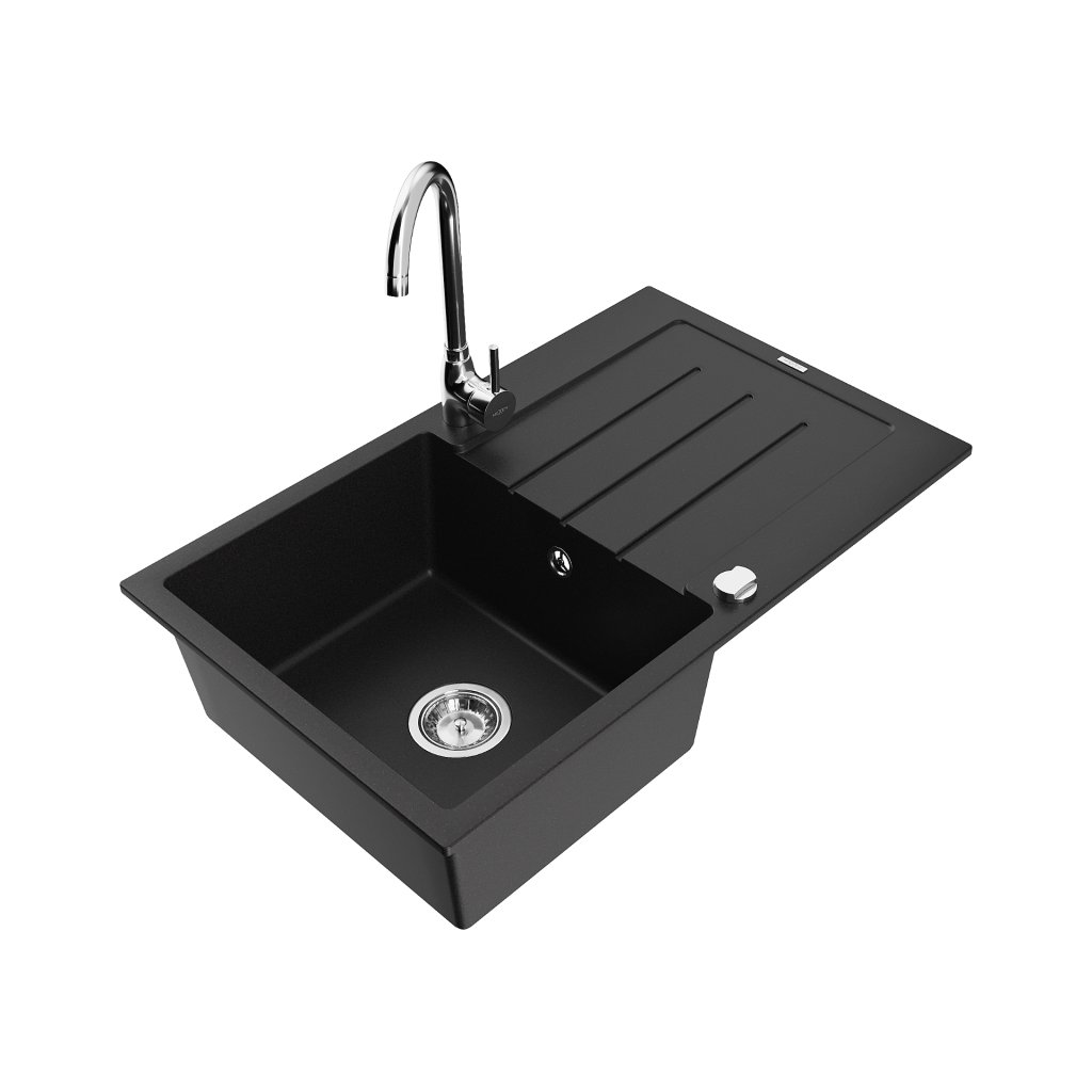 Mexen Bruno, 1 kamrás gránit mosogató csepptálcával 80x50 cm, konyhai csaptelep Telma, fekete, 6513-77-670200-00