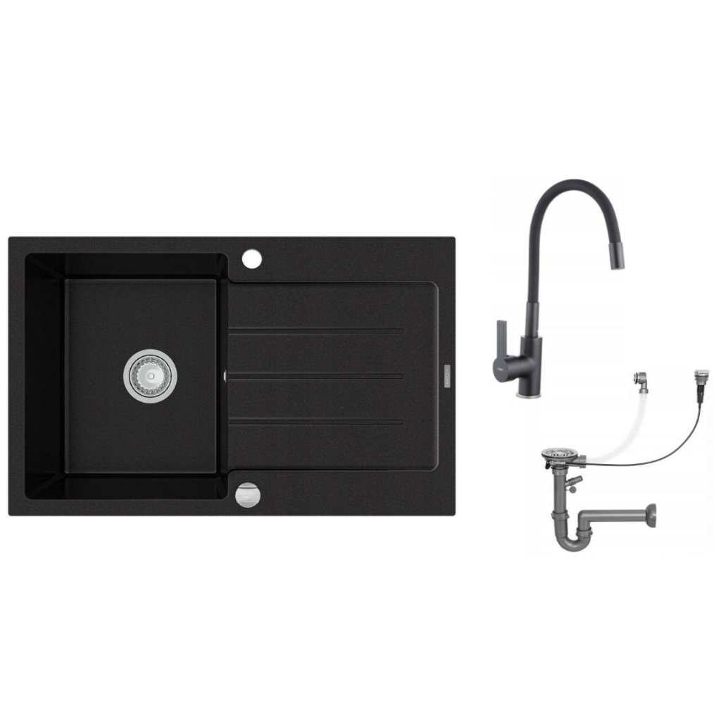 Mexen Bruno - gránit mosogató 79,5x49,5cm + Flex csaptelep, 1 kamrás, fekete, 6513791010-77-Flex