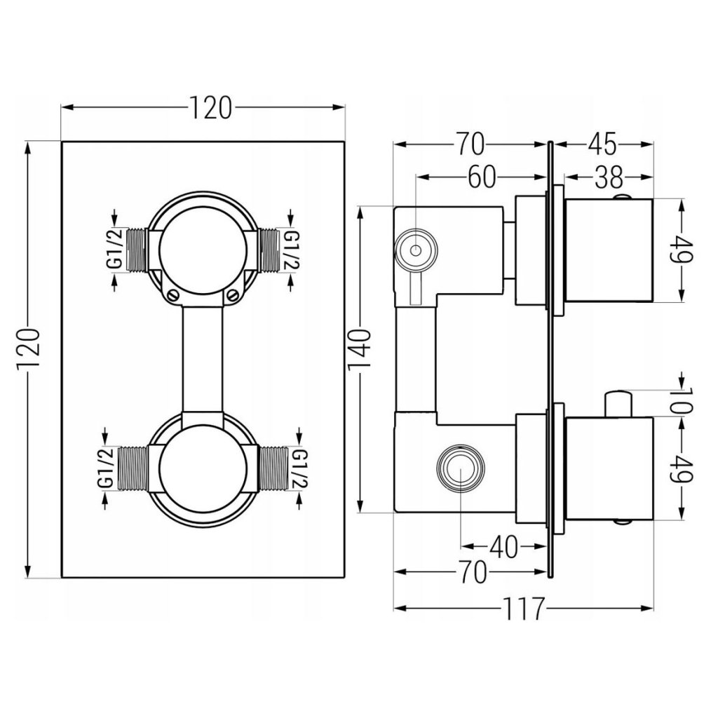 1. Termosztatikus keverő, rejtett keverő kapcsolóval (2 kimenetes ház)