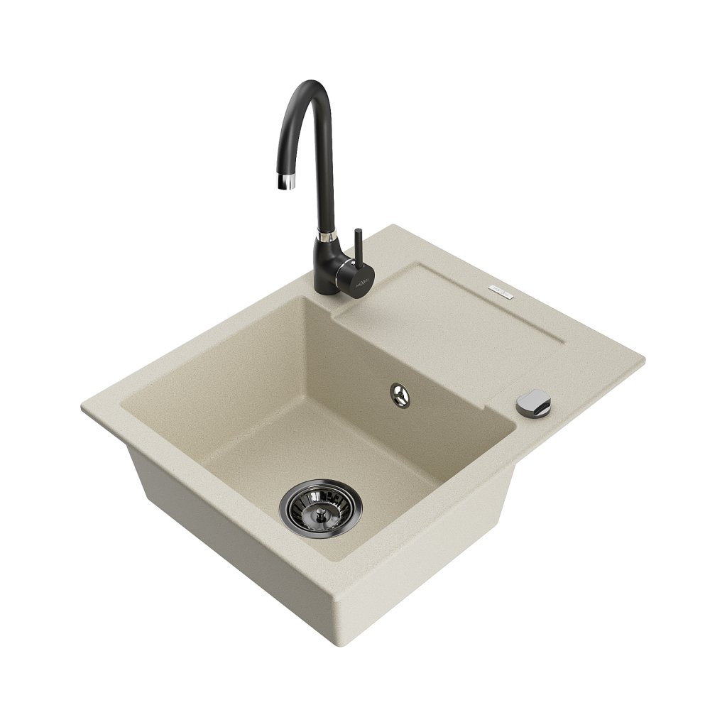 Mexen Enzo, gránit mosogató 576x465x174 mm, 1 kamrás, fekete Telma csaptelep, bézs, 6506-69-670200-70