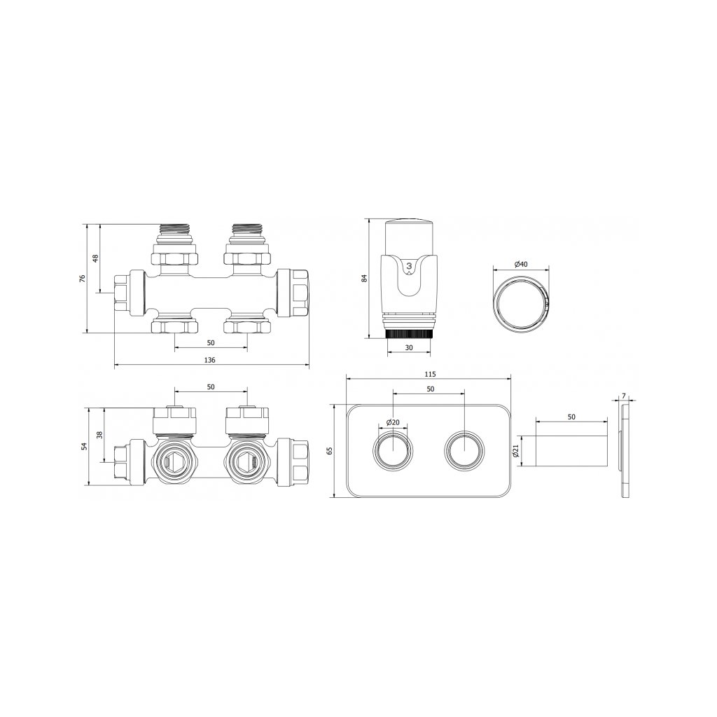 - A maszkolókészlet egy dupla rozettából és két hüvelyből áll, amelyek termosztatikus készletek és radiátorszelepek felszerelésére szolgálnak.