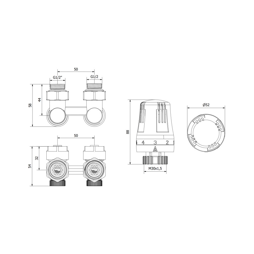 Mexen G01, saroktermosztatikus készlet DN50, szög 1/2"x16 mm, termosztatikus fejjel M30x1,5 mm, acél, W911-016-918-01