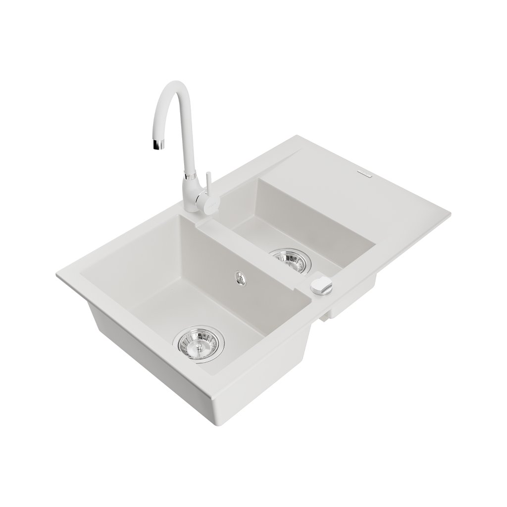 Mexen Gaspar, 1,5 kamrás gránit mosogató csepptálcával 74x48 cm konyhai csaptelep Telma, fehér, 6507-20-670200-20