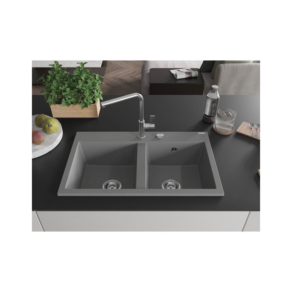 Mexen Hektor, 2 kamrás gránit mosogató 800x480x205 mm, szürke, króm szifon, 6521802000-71
