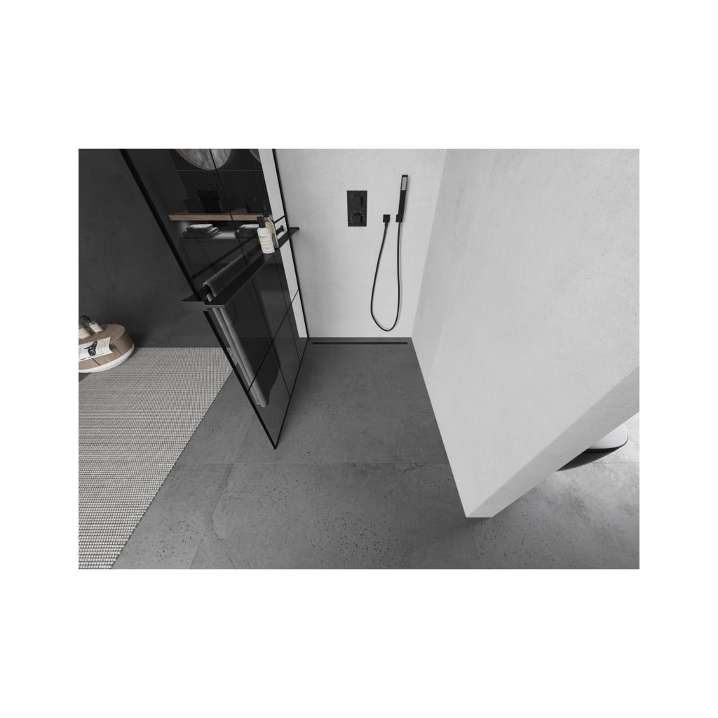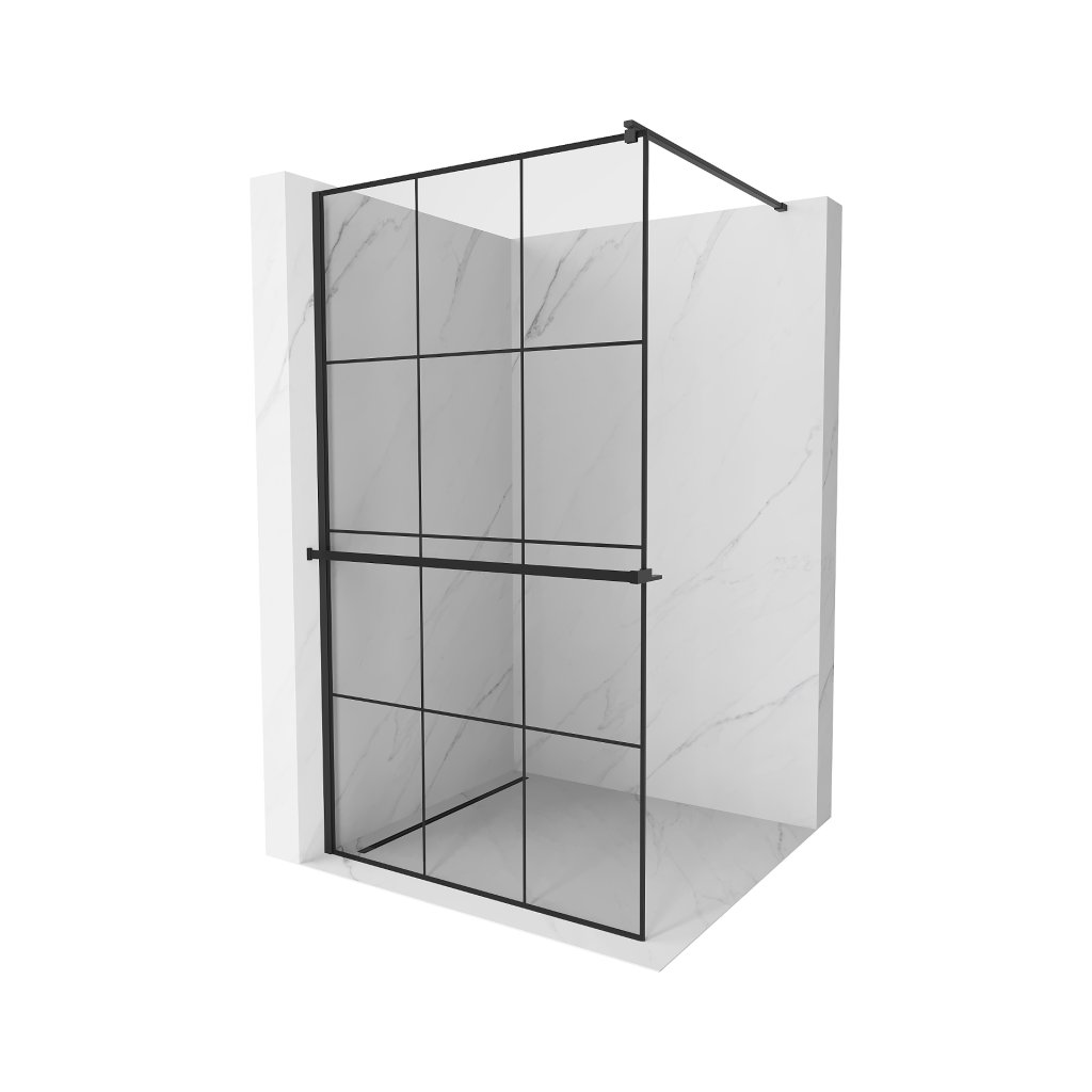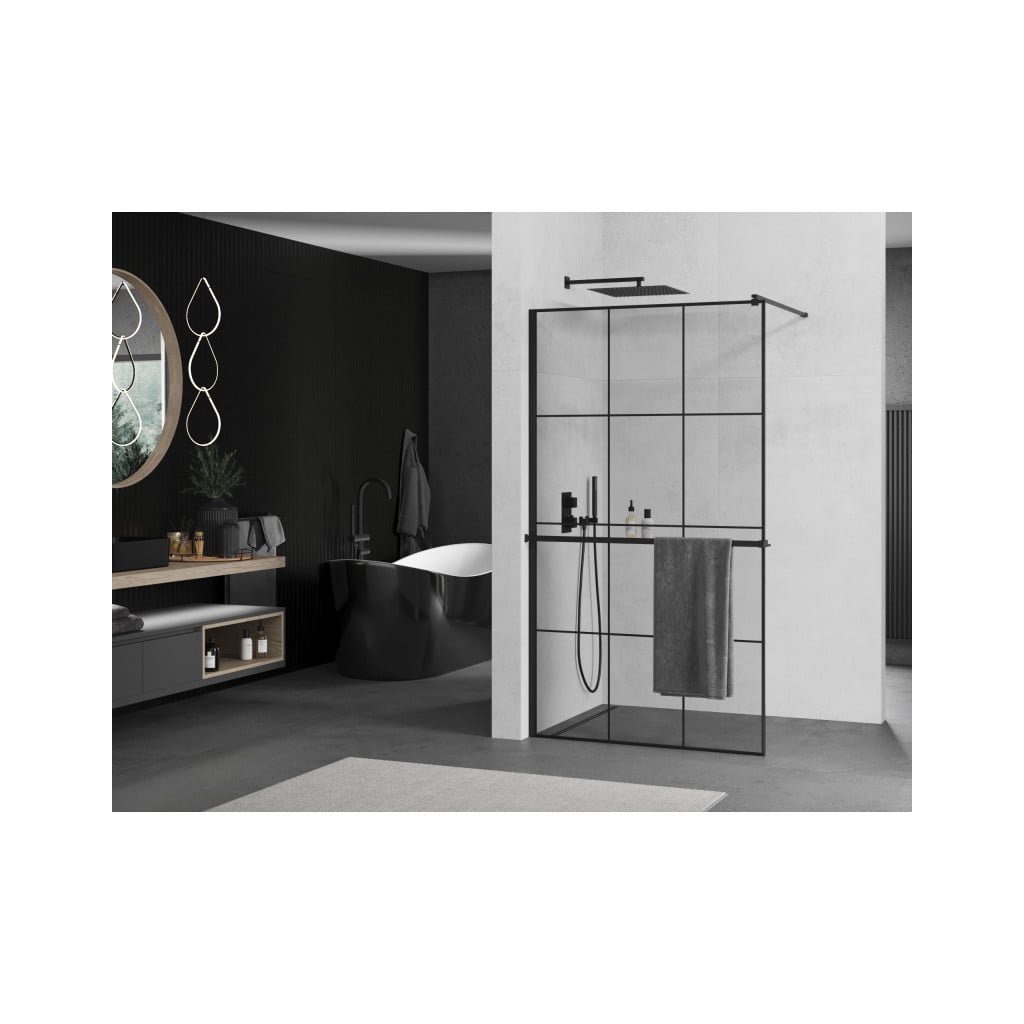 Mexen Kioto +, zuhany paraván polccal és törölközőtartóval 100 x 200 cm, 8mm üveg átlátszó üvegmintás fekete, fekete profil, 800-100-121-70-77