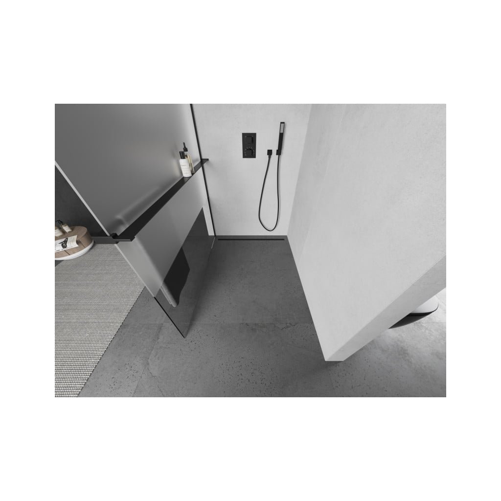 Mexen Kioto +, zuhany paraván polccal és törölközőtartóval 110 x 200 cm, 8 mm-es átlátszó jegesedés üveg, fekete profil, 800-110-121-70-35