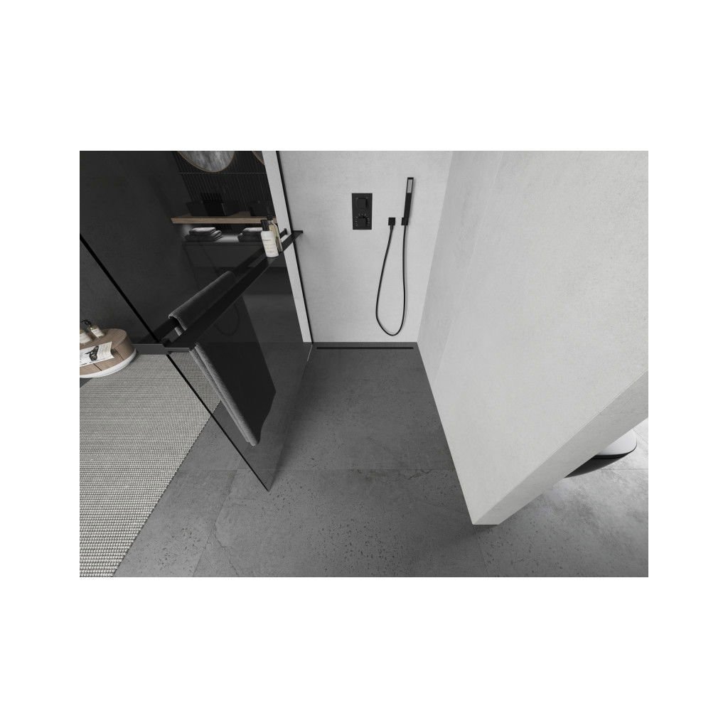 Mexen Kioto +, zuhany paraván polccal és törölközőtartóval 110 x 200 cm, 8mm átlátszó üveg, fekete profil, 800-110-121-70-00