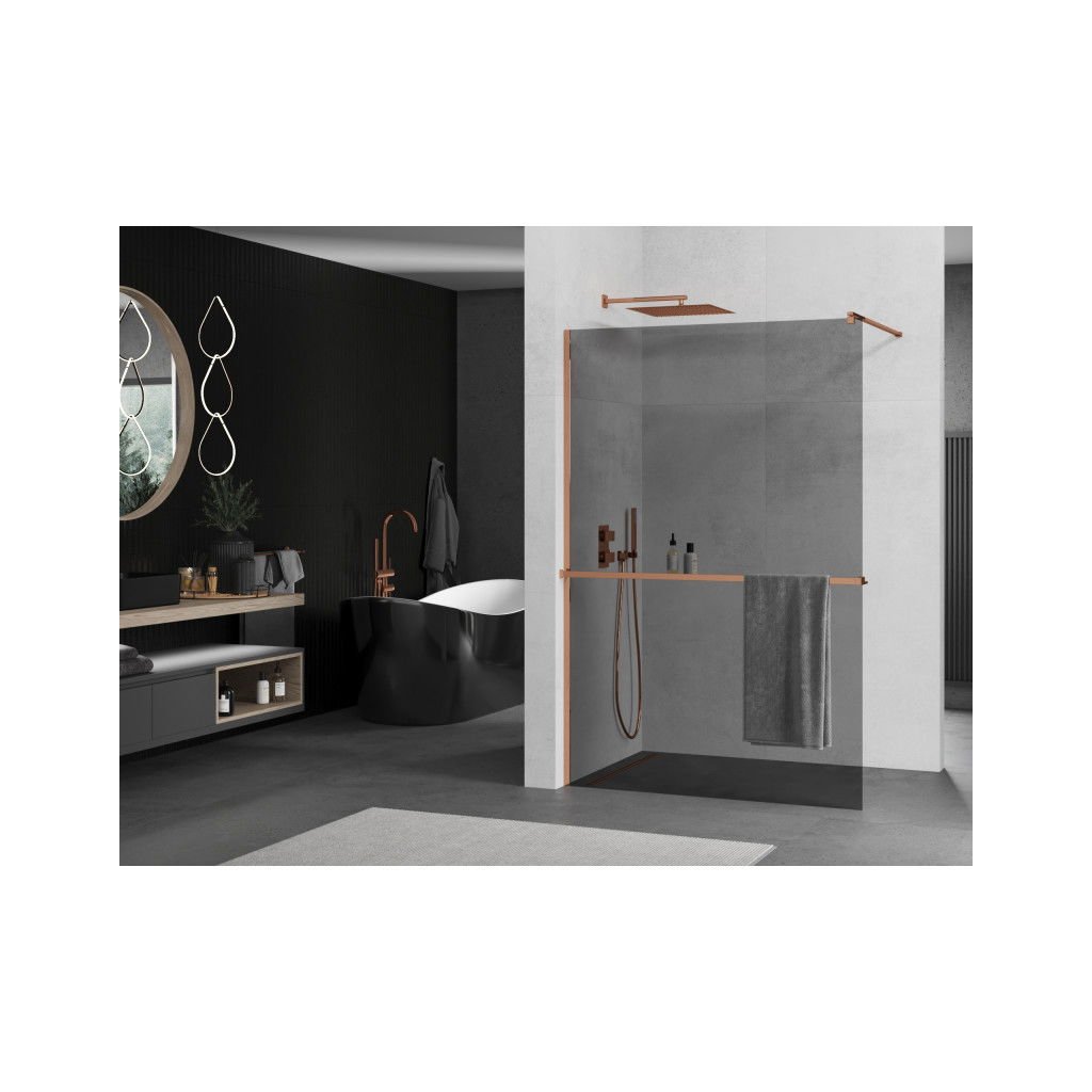 Mexen Kioto +, zuhany paraván polccal és törölközőtartóval 110 x 200 cm, 8mm szürke üveg, rózsa arany profil, 800-110-121-60-40