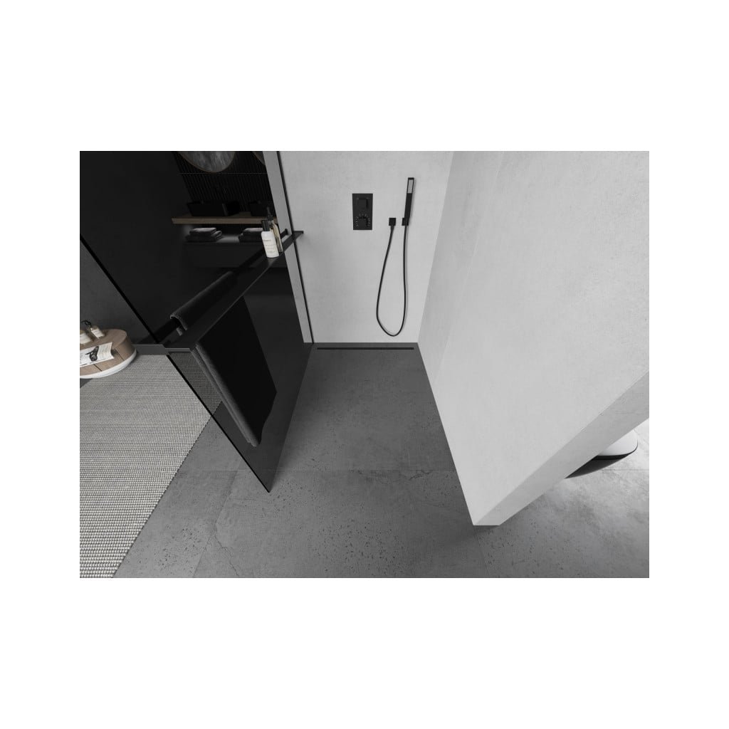Mexen Kioto +, zuhany paraván polccal és törölközőtartóval 120 x 200 cm, 8mm szürke üveg, fekete profil, 800-120-121-70-40