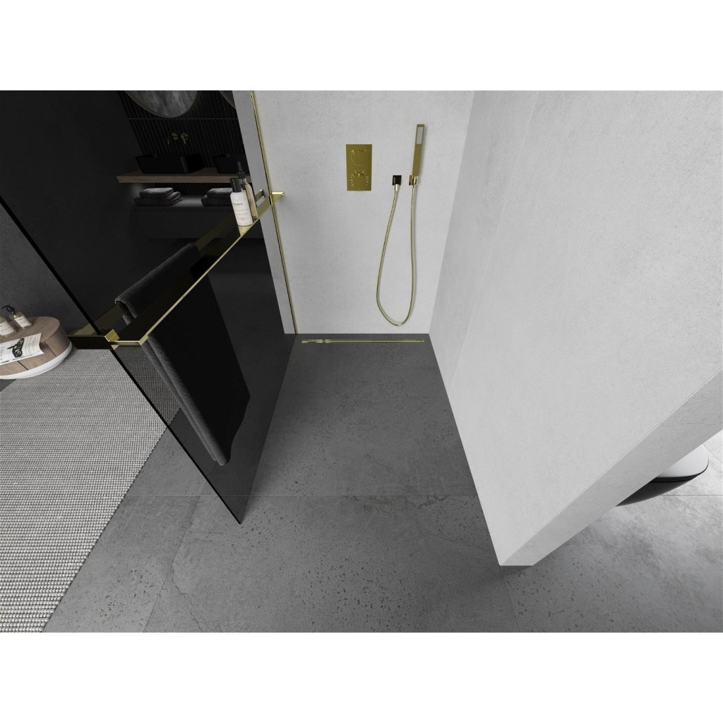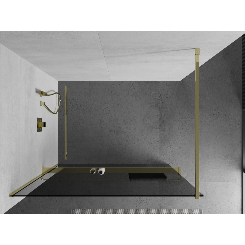 Mexen Kioto +, zuhany paraván polccal és törölközőtartóval 130 x 200 cm, 8mm szürke üveg, arany profil, 800-130-121-50-40
