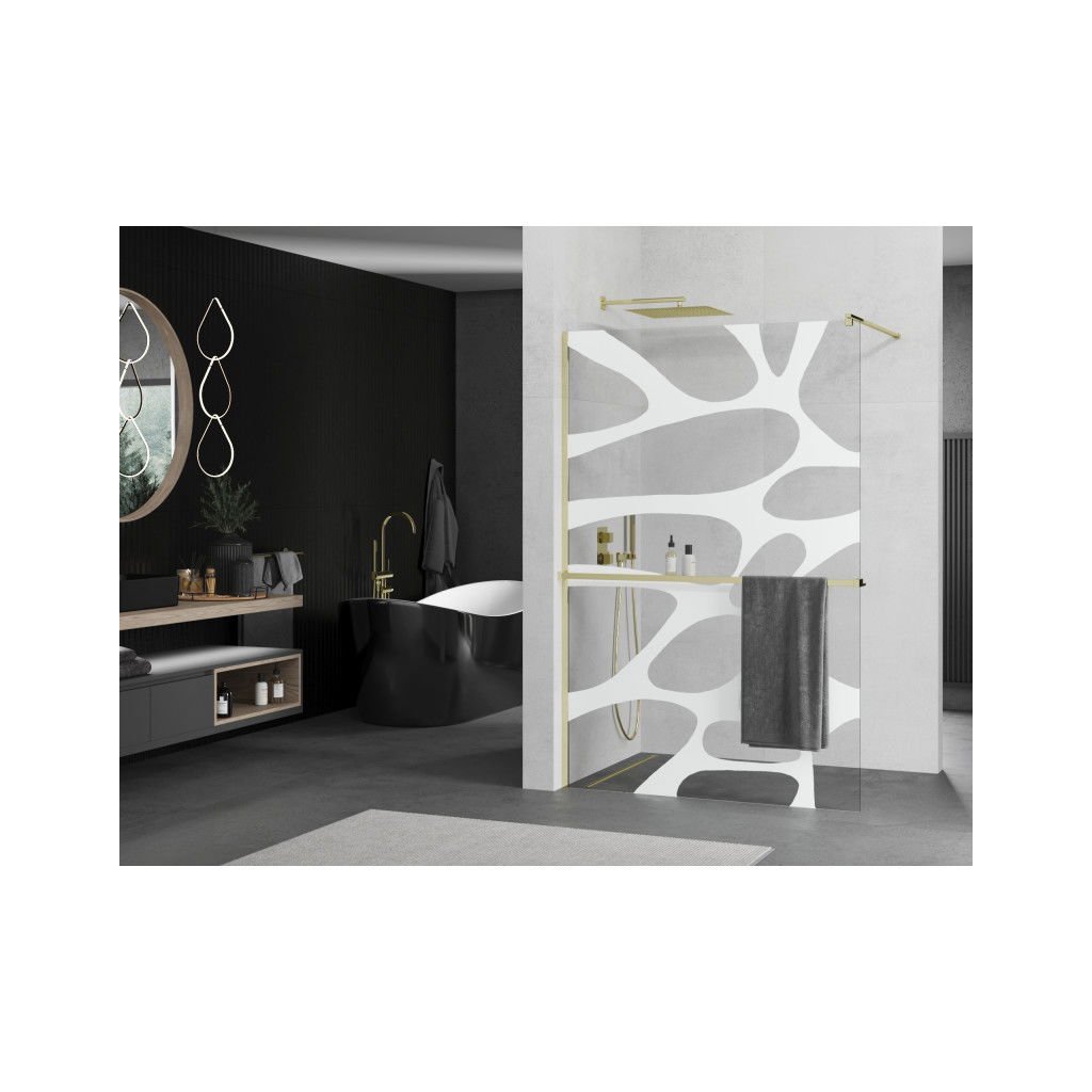 Mexen Kioto +, zuhany paraván polccal és törölközőtartóval 140 x 200 cm, 8mm átlátszó üvegmintás fehér, arany profil 800-140-121-50-97
