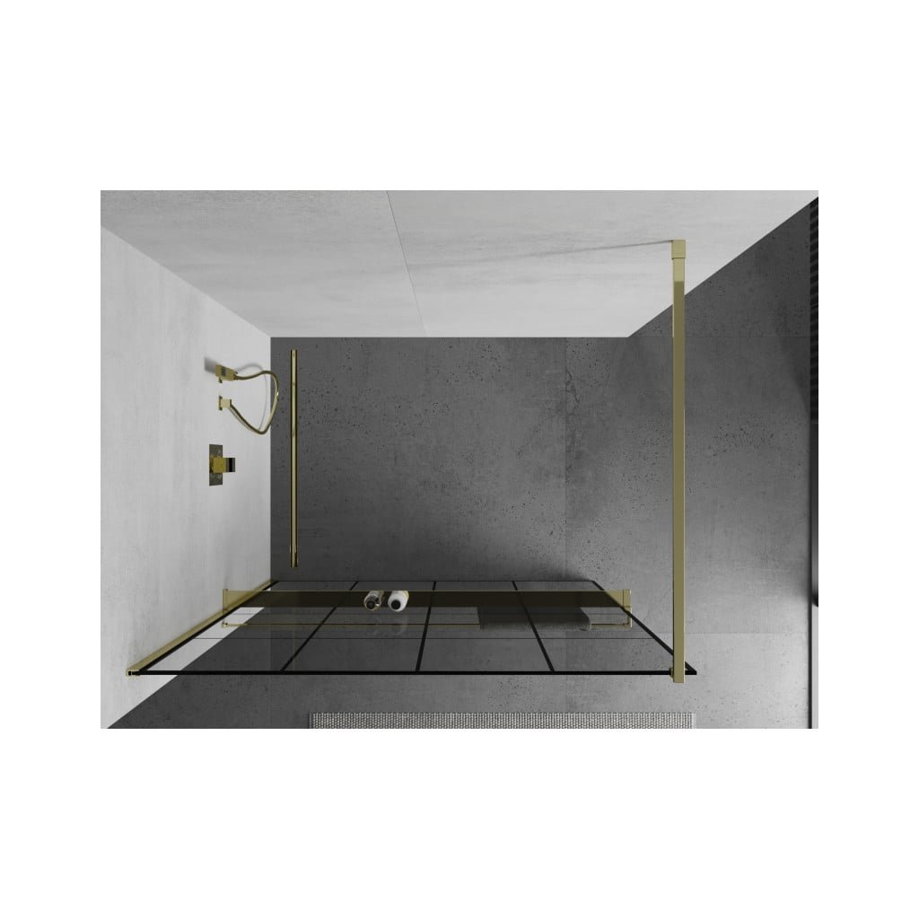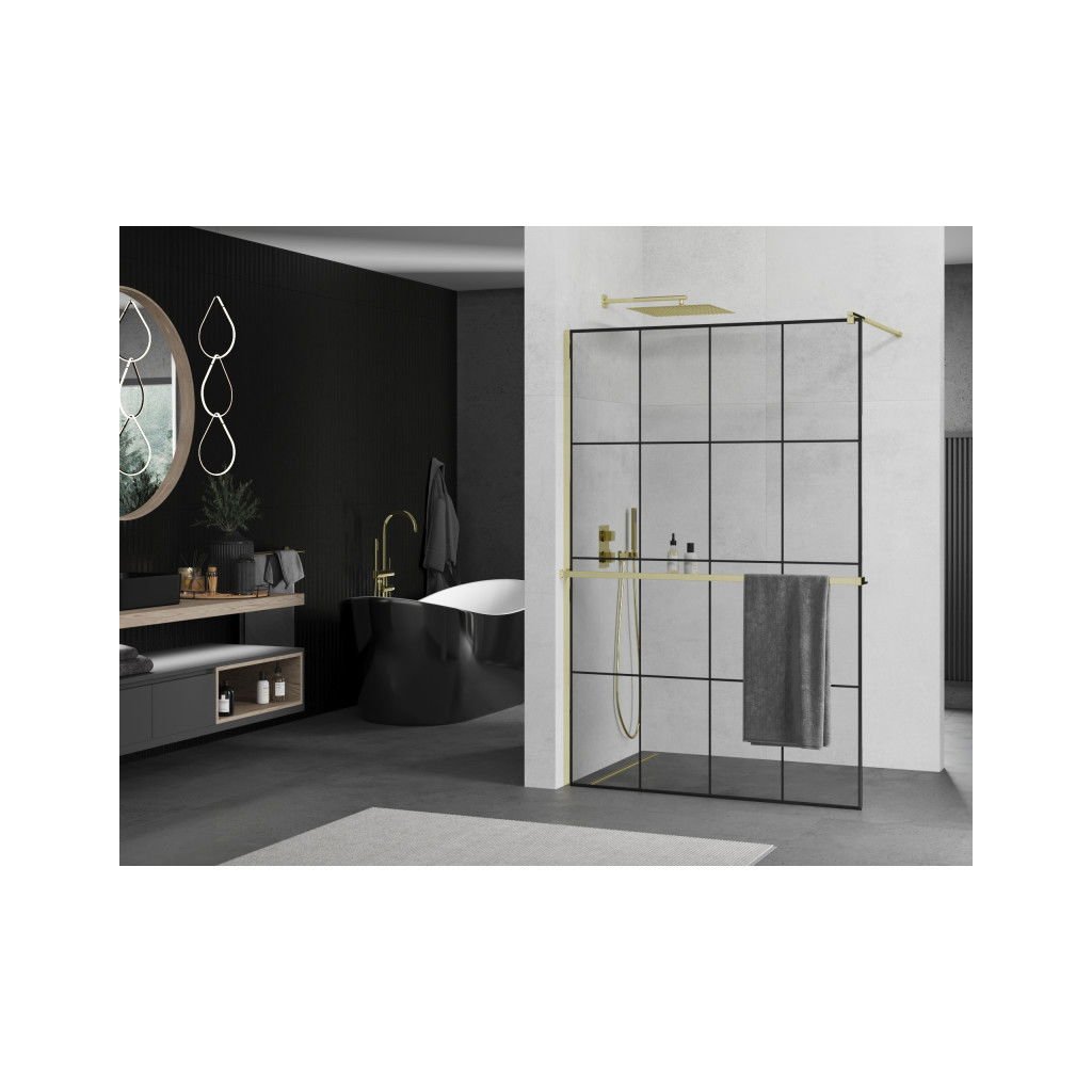 Mexen Kioto +, zuhany paraván polccal és törölközőtartóval 140 x 200 cm, 8mm átlátszó üvegmintás fekete, arany profil, 800-140-121-50-77