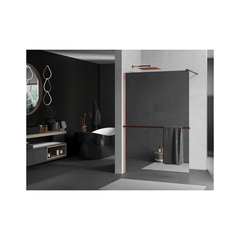Mexen Kioto +, zuhany paraván polccal és törölközőtartóval 80 x 200 cm, 8 mm-es üvegmintás tükör, rózsa arany profil, 800-080-121-60-50