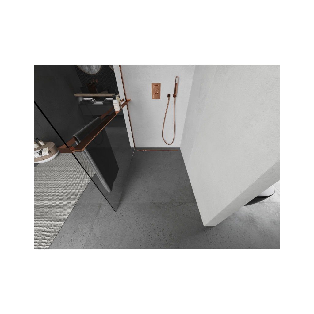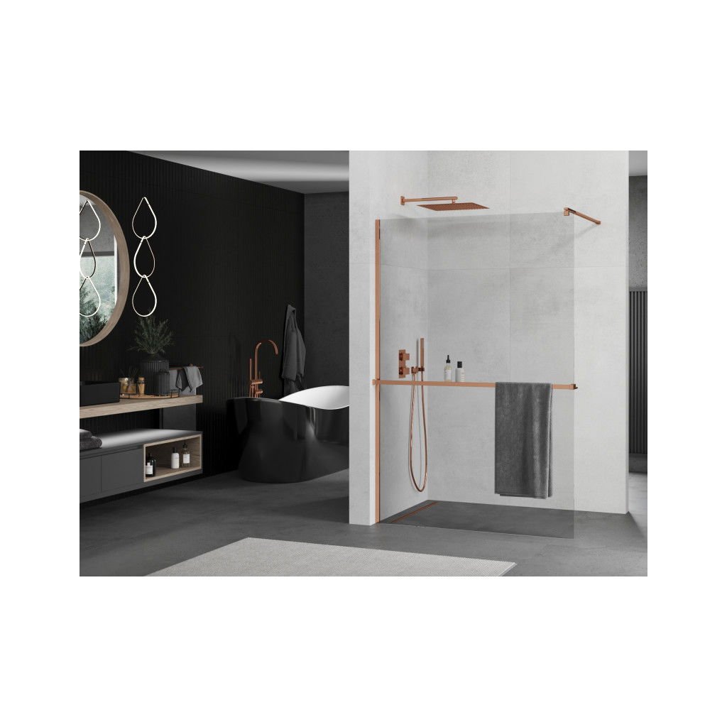 Mexen Kioto +, zuhany paraván polccal és törölközőtartóval 80 x 200 cm, 8mm átlátszó üveg, rózsa arany profil, 800-080-121-60-00