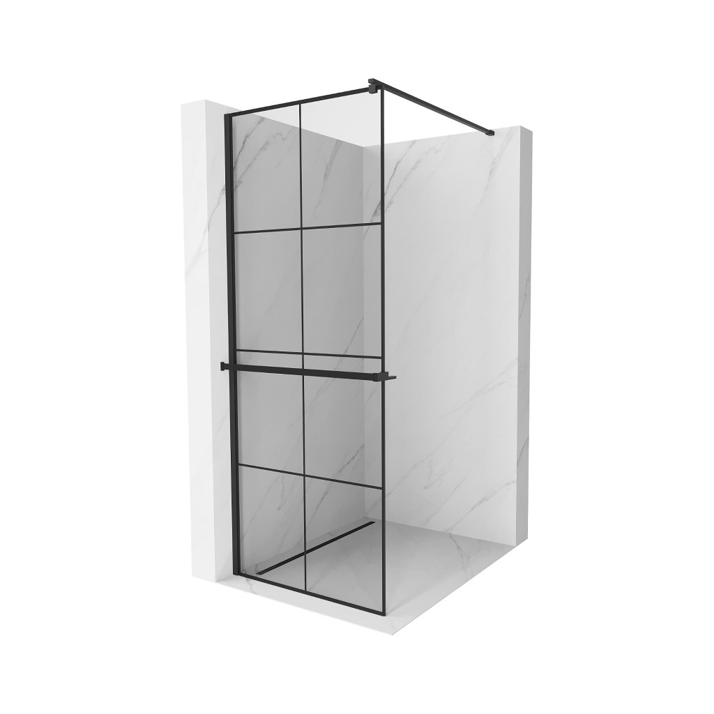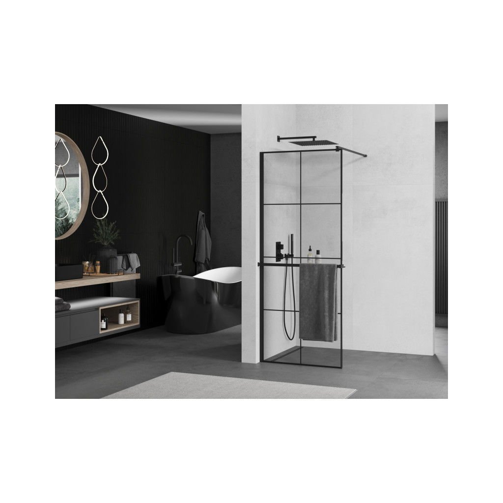 Mexen Kioto +, zuhany paraván polccal és törölközőtartóval 80 x 200 cm, 8mm üveg átlátszó üvegmintás fekete, fekete profil, 800-080-121-70-77