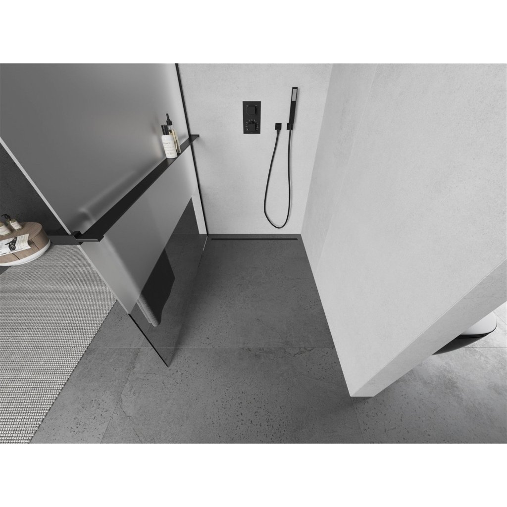 Mexen Kioto +, zuhany paraván polccal és törülközőtartóval 140 x 200 cm, 8mm átlátszó jegesedés üveg, fekete profil, 800-140-121-70-35