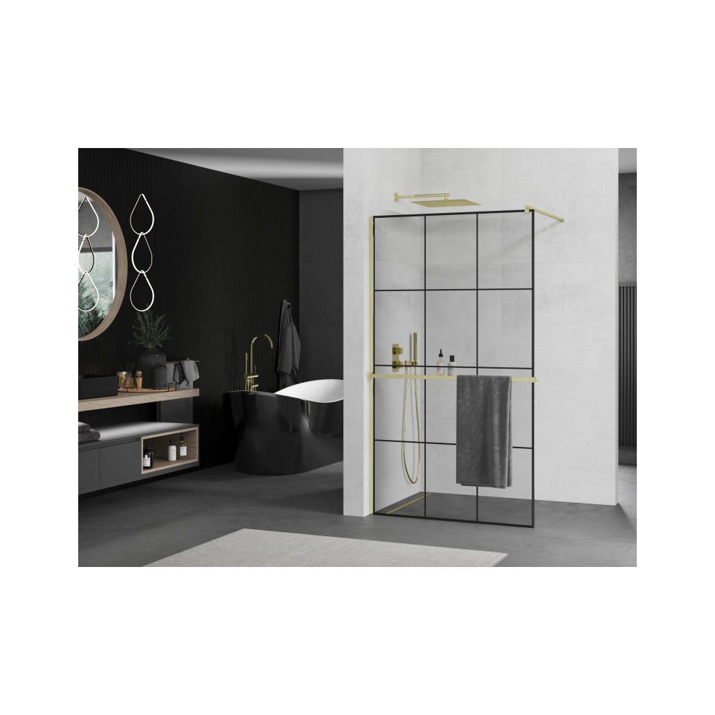 Mexen Kioto +, zuhanyparaván polccal és törölközőtartóval 100 x 200 cm, 8mm átlátszó üvegmintás fekete, arany profil, 800-090-121-50-77