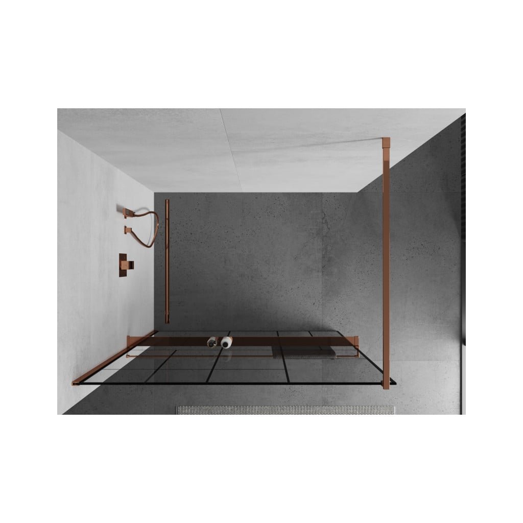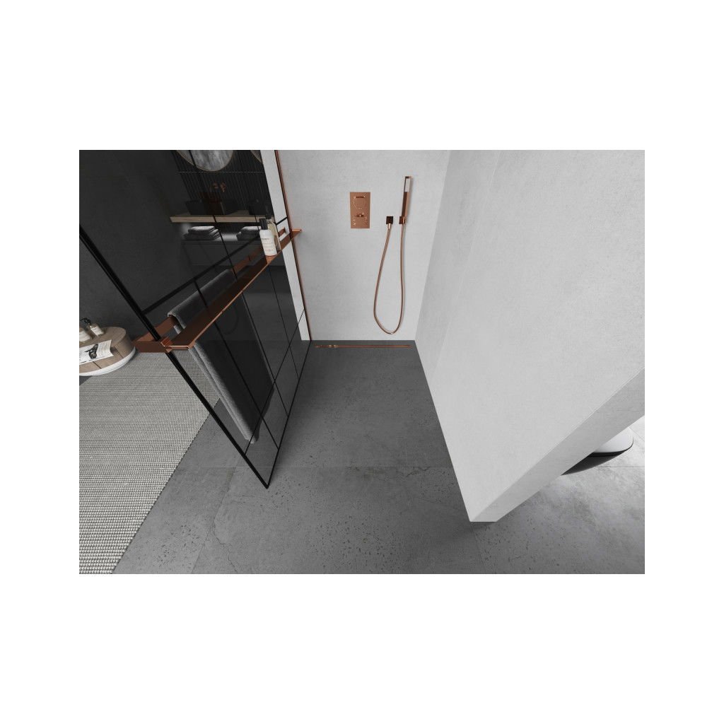 Mexen Kioto +, zuhanyparaván polccal és törölközőtartóval 130 x 200 cm, 8mm átlátszó üvegmintás fekete, rózsa arany profil, 800-130-121-60-78