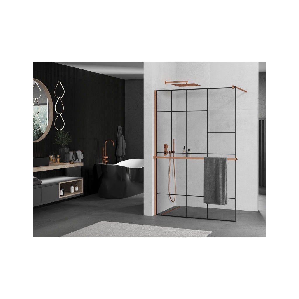 Mexen Kioto +, zuhanyparaván polccal és törölközőtartóval 140 x 200 cm, 8mm átlátszó üvegmintás fekete, rózsa arany profil, 800-140-121-60-78