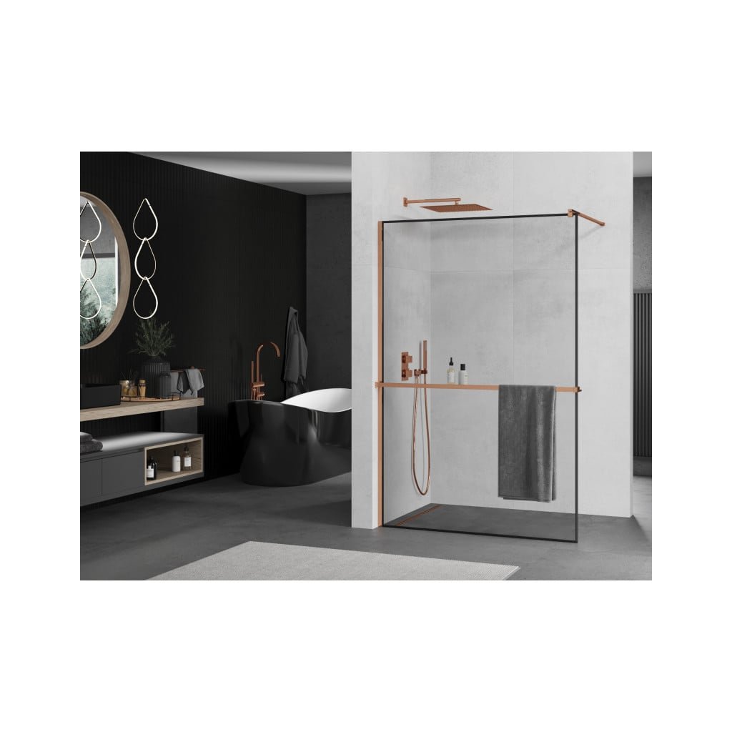 Mexen Kioto +, zuhanyparaván polccal és törölközőtartóval 70 x 200 cm, 8mm átlátszó üvegmintás fekete, rózsa arany profil, 800-070-121-60-70