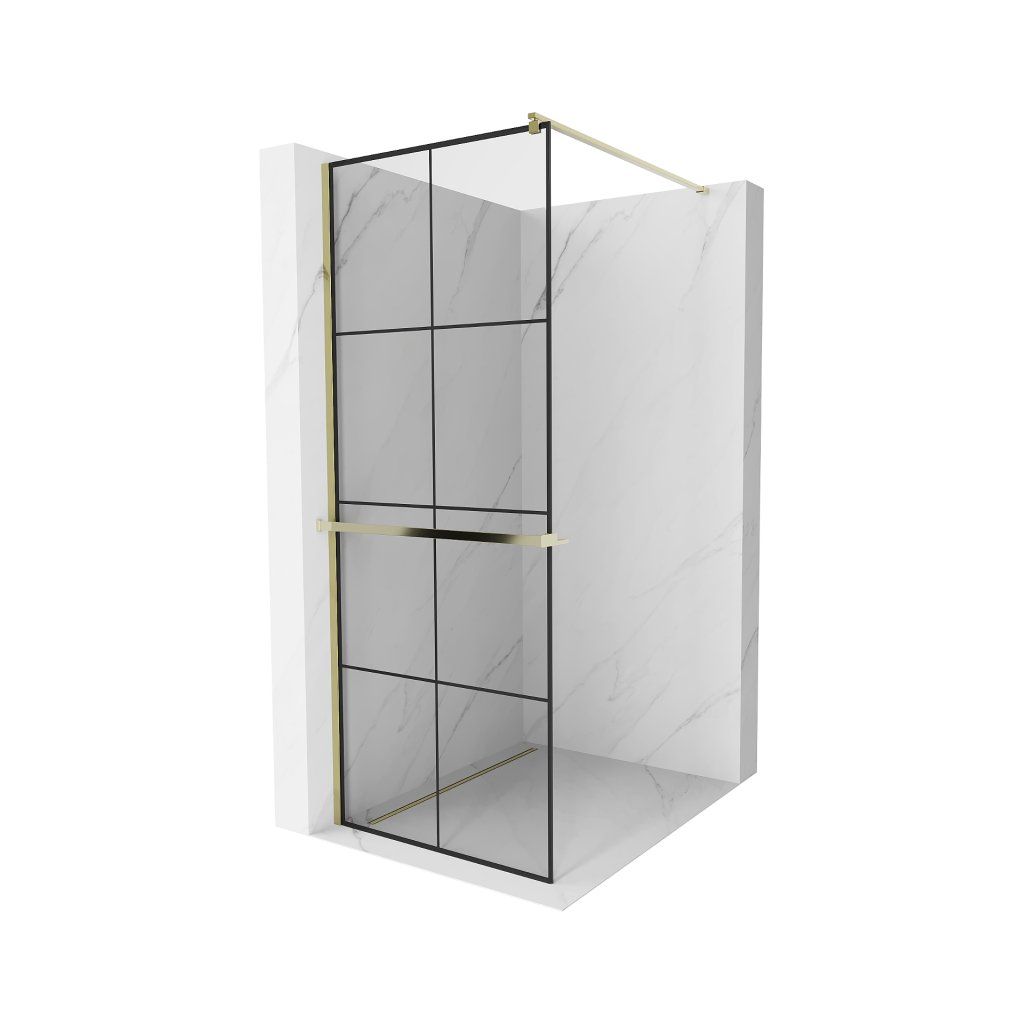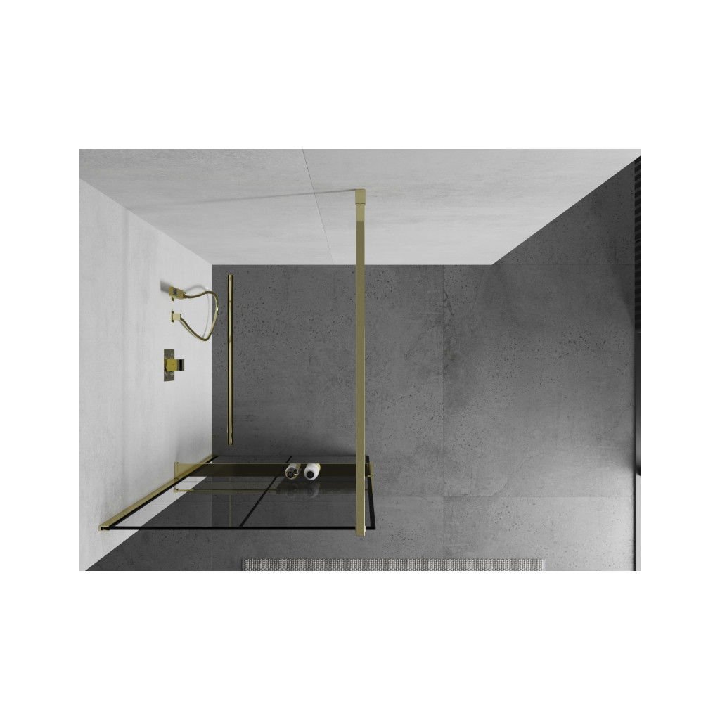 Mexen Kioto +, zuhany paraván polccal és törölközőtartóval 80 x 200 cm, 8mm átlátszó üvegmintás fekete, arany profil, 800-080-121-50-77