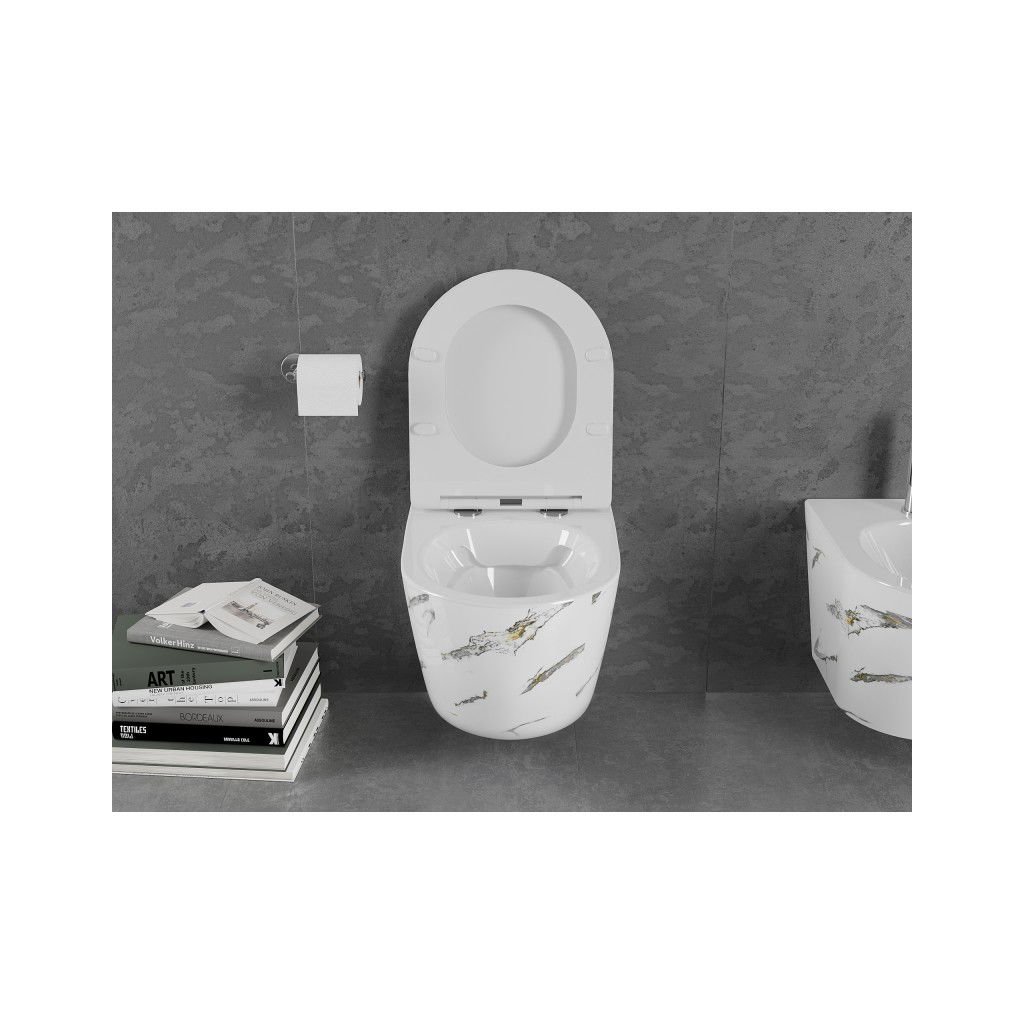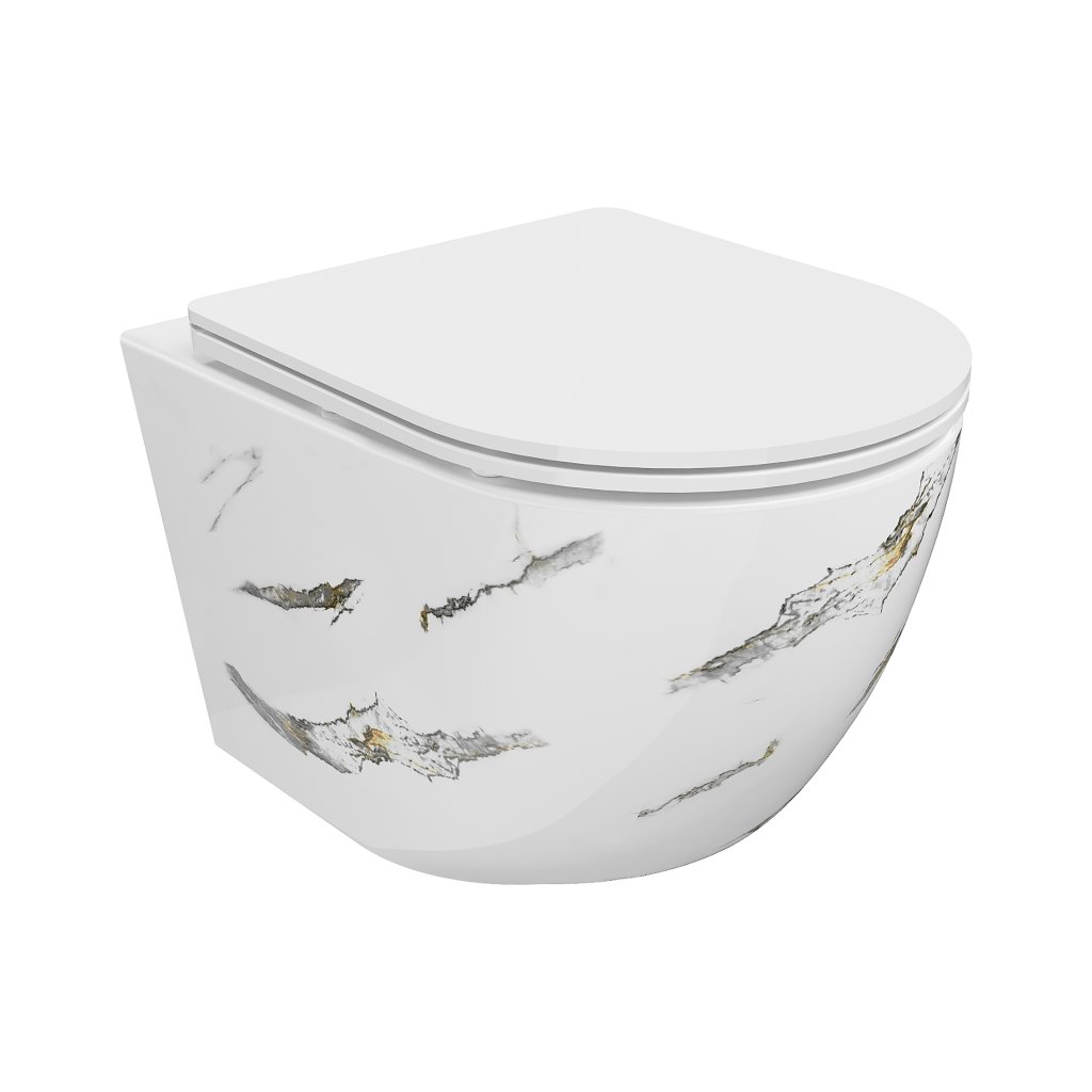 Mexen Lena, Perem nélküli fali WC csésze duroplasztikus ülőkével, lassan záródó, márvány-fehér kőutánzattal, 30224091