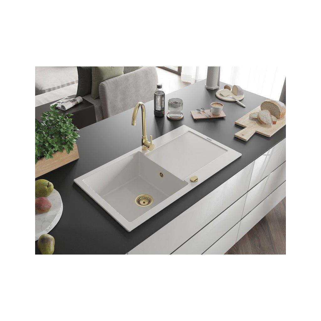 Mexen Leo, gránit mosogató 900x500x190 mm, 1 kamrás, fehér, arany szifonnal, 6501901010-20-G