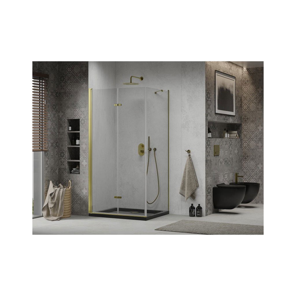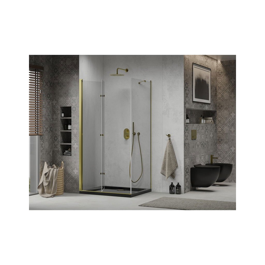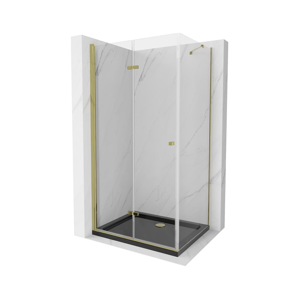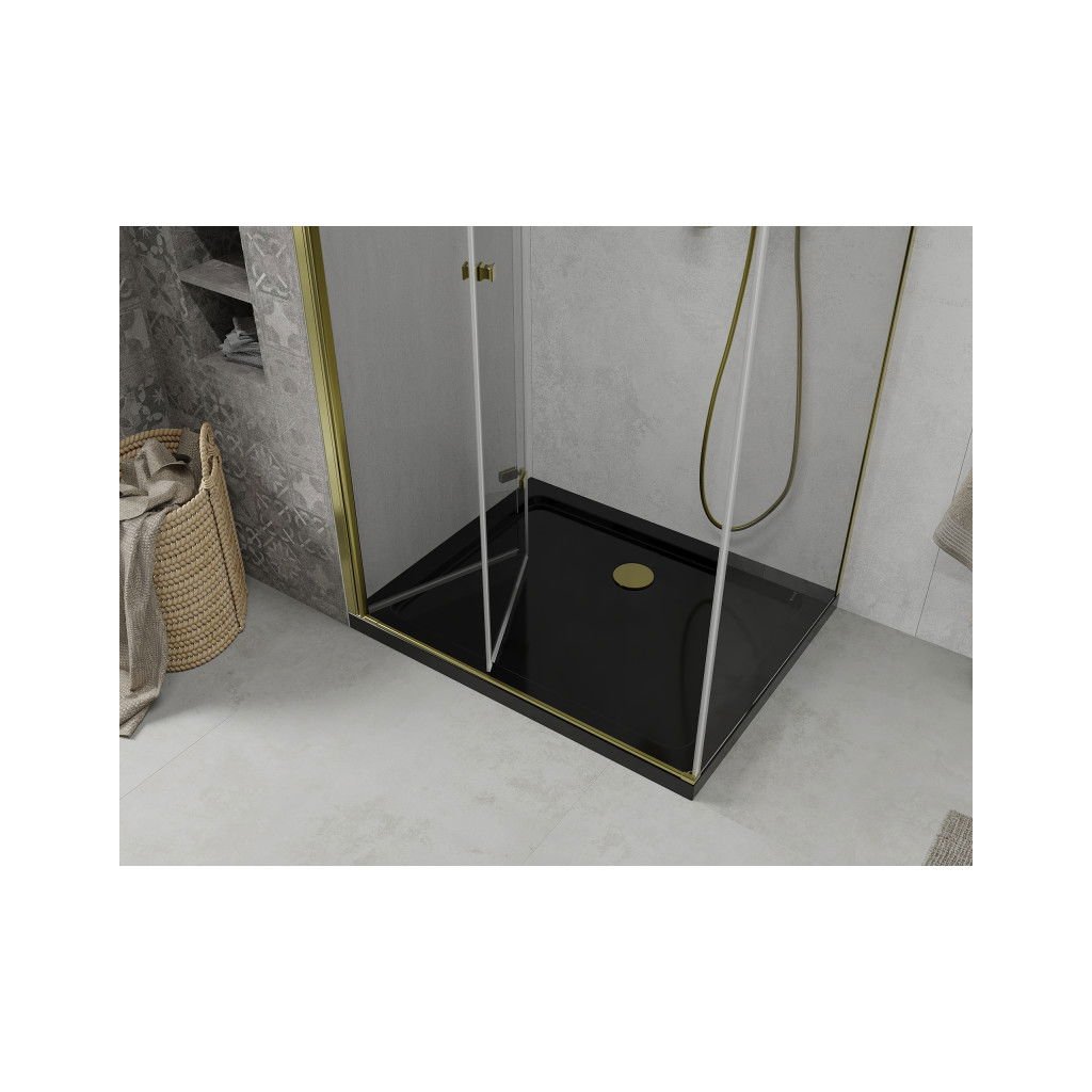 Mexen Lima, zuhanykabin összecsukható ajtóval 80 (ajtó) x 100 (fal) cm, 6mm átlátszó üveg, króm profil + vékony zuhanytálca fekete + arany szifon, 856-080-100-50-00-4070G