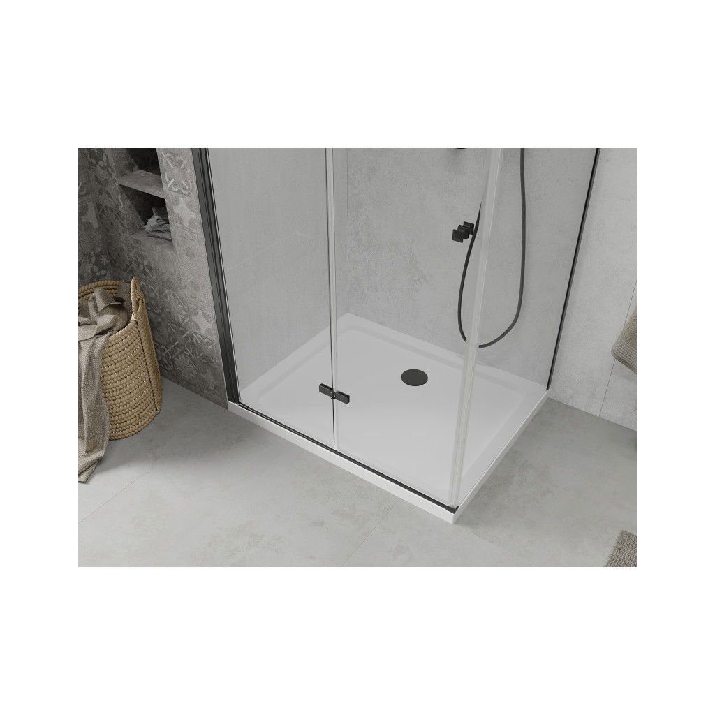 Mexen Lima, zuhanykabin összecsukható ajtóval 80 (ajtó) x 70 (fali) cm, 6mm átlátszó üveg, fekete profil + vékony zuhanytálca fehér fekete szifonnal, 856-080-070-70-00-4010B