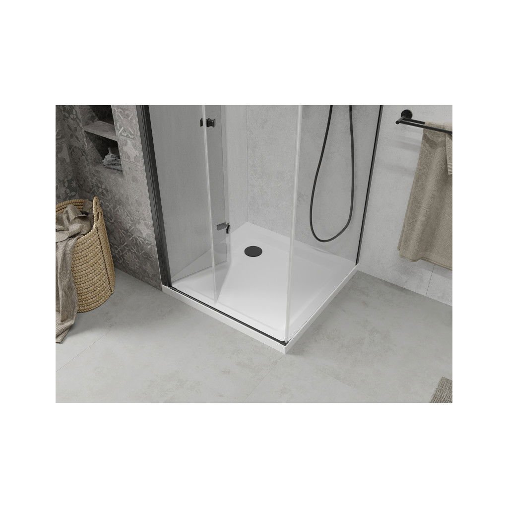 Mexen Lima, zuhanykabin összecsukható ajtóval 80 (ajtó) x 80 (fal) cm, 6mm átlátszó üveg, fekete profil + vékony zuhanytálca fehér fekete szifonnal, 856-080-080-70-00-4010B