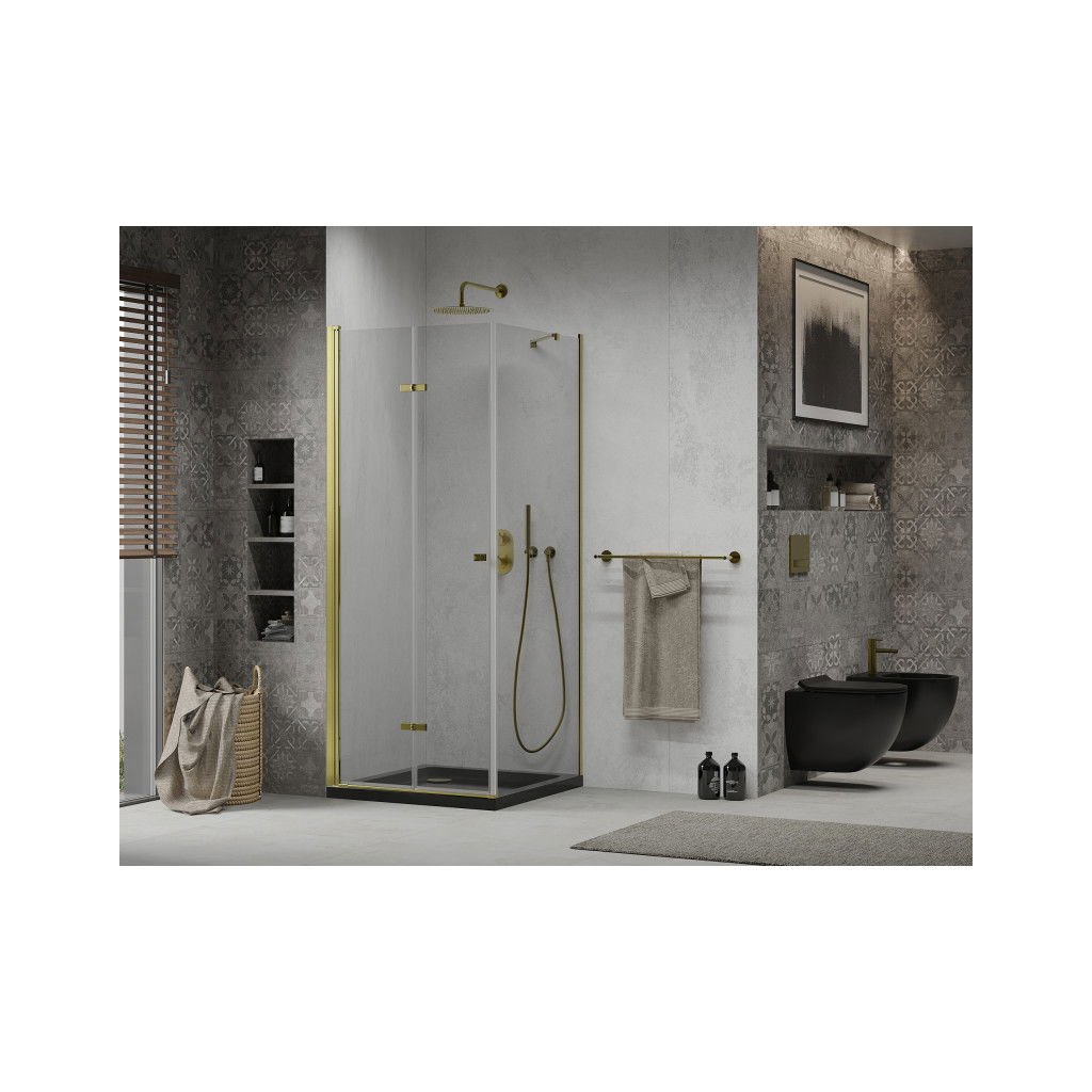 Mexen Lima, zuhanykabin összecsukható ajtóval 80 (ajtó) x 80 (fali) cm, 6mm átlátszó üveg, króm profil + vékony zuhanytálca fekete + arany szifon, 856-080-080-50-00-4070G