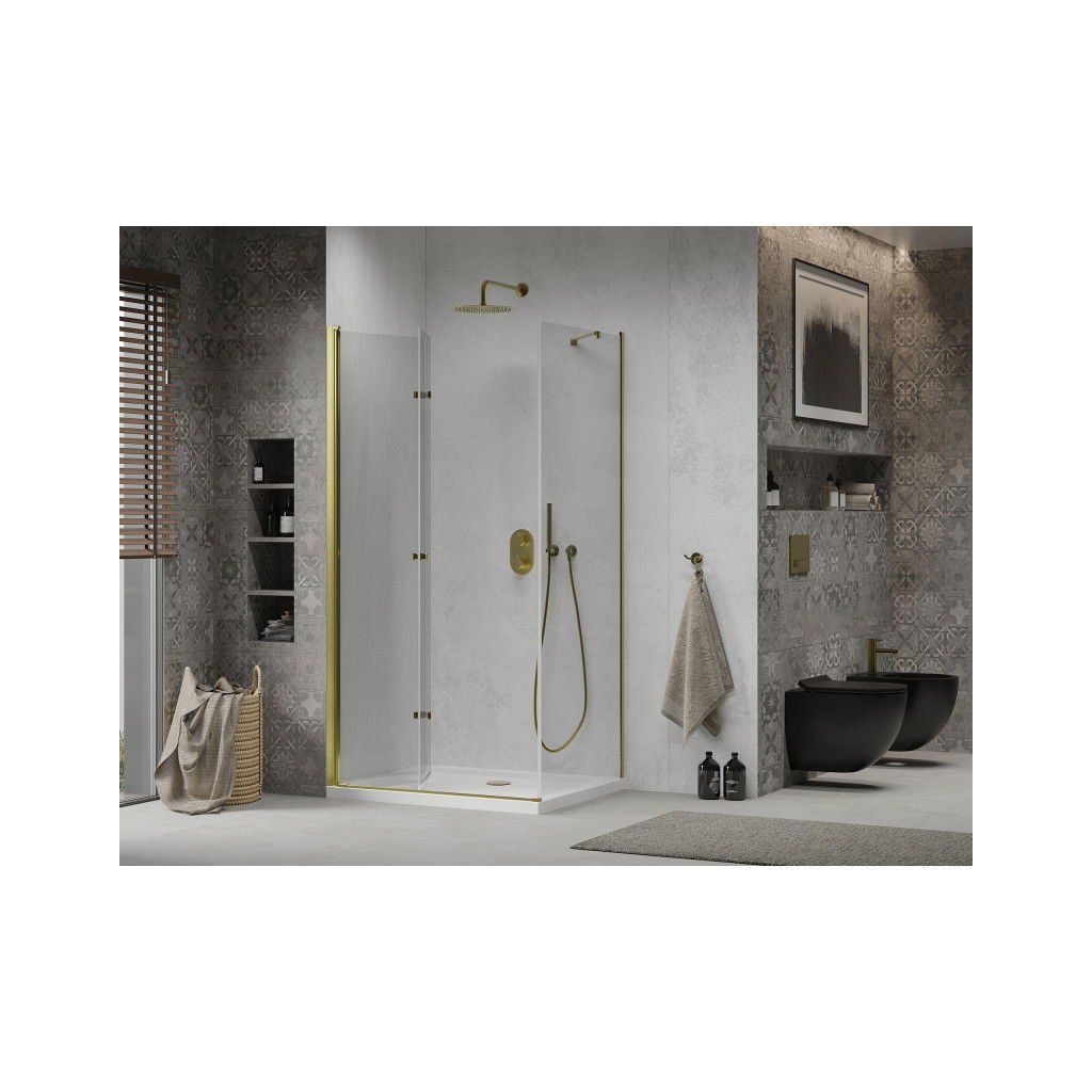 Kiváló választás minden fürdőszobába. Az elegáns zuhanykabin 6 mm vastag edzett üvegből készült, átlátszó kivitelben. Az alkalmazott üvegfelület-kezelés minden felhasználó számára maximális kényelmet biztosít. Ez a technológia egyedülálló lerakódásgátló tulajdonságokat garantál – csak öblítse le a felületet vízzel. A sarok arany alumínium profilokba van felszerelve, és tömítéssel van ellátva, amely megakadályozza a víz kijutását a zuhanyon kívülre. A zuhanyajtó összecsukható (két üveg, minőségi zsanérokkal összekötve, ki- és behajtási lehetőséggel). A nyitáshoz tisztességes fém fogantyút használnak A zuhanykabin univerzális - beszereléskor döntheti el, hogy jobbra vagy balra nyílik-e. A profilsínek lehetővé teszik a szabályozással a falak esetleges egyenetlenségeit.