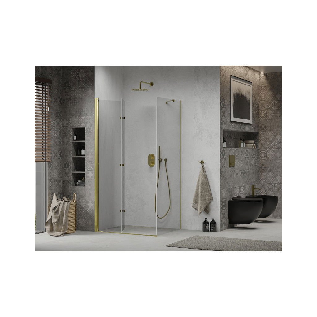 Kiváló választás minden fürdőszobába. Az elegáns zuhanykabin 6 mm vastag edzett üvegből készült, átlátszó kivitelben. Az alkalmazott üvegfelület-kezelés minden felhasználó számára maximális kényelmet biztosít. Ez a technológia egyedülálló lerakódásgátló tulajdonságokat garantál – csak öblítse le a felületet vízzel. A sarok arany alumínium profilokba van szerelve, és tömítéssel van ellátva, amely megakadályozza a víz kijutását a zuhanyon kívülre. A zuhanyajtó összecsukható (két üveg, minőségi zsanérokkal összekötve, ki- és behajtási lehetőséggel). A nyitáshoz megfelelő fém fogantyút használnak.