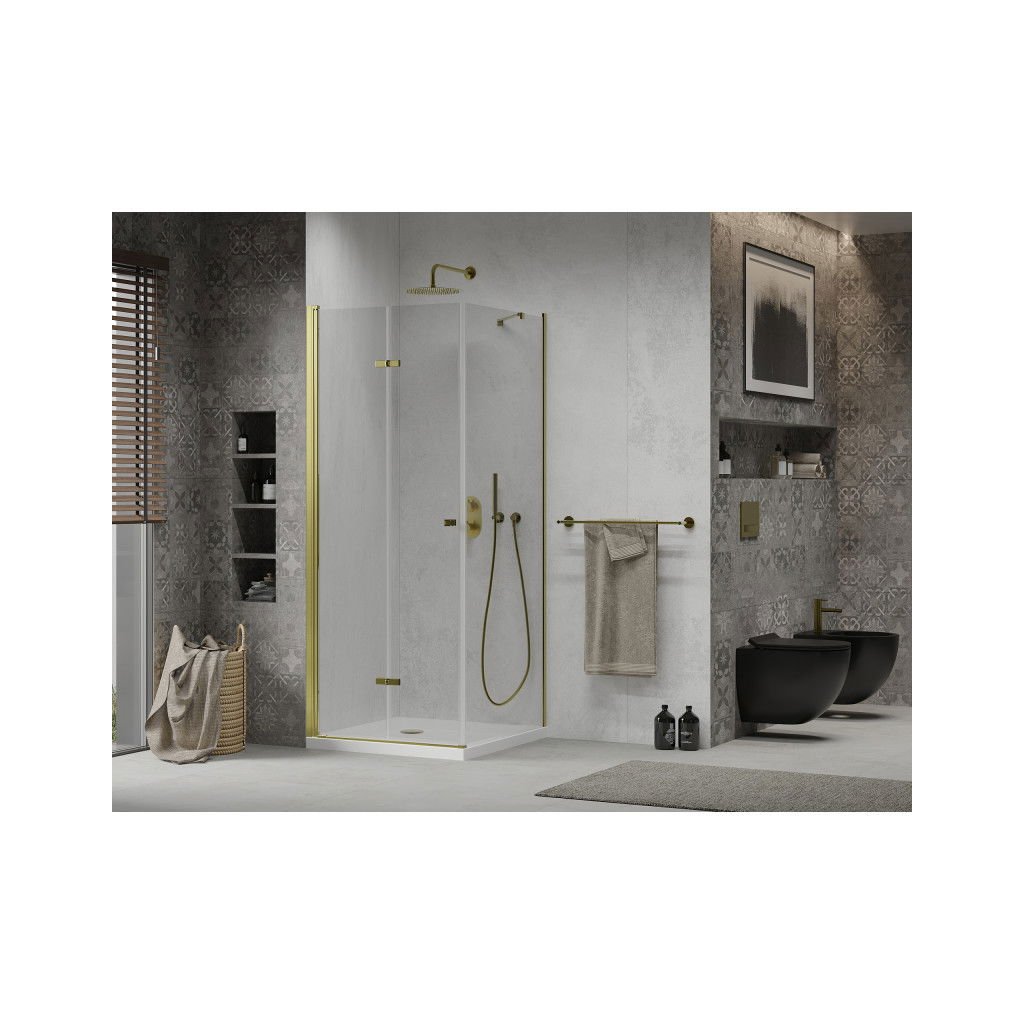 Kiváló választás minden fürdőszobába. Az elegáns zuhanykabin 6 mm vastag edzett üvegből készült, átlátszó kivitelben. Az alkalmazott üvegfelület-kezelés minden felhasználó számára maximális kényelmet biztosít. Ez a technológia egyedülálló lerakódásgátló tulajdonságokat garantál – csak öblítse le a felületet vízzel. A sarok arany alumínium profilokba van szerelve, és tömítéssel van ellátva, amely megakadályozza a víz kijutását a zuhanyon kívülre. A zuhanyajtó összecsukható (két üveg, minőségi zsanérokkal összekötve, ki- és behajtási lehetőséggel). A nyitáshoz megfelelő fém fogantyút használnak. A zuhanykabin univerzális – beszereléskor döntheti el, hogy jobbra vagy balra nyitja-e. A profilsínek lehetővé teszik a szabályozással a falak esetleges egyenetlenségeit.