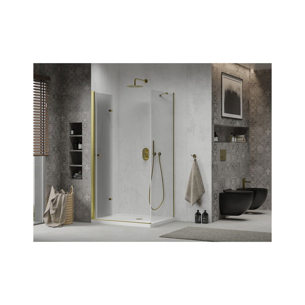 Kiváló választás minden fürdőszobába. Az elegáns zuhanykabin 6 mm vastag edzett üvegből készült, átlátszó kivitelben. Az alkalmazott üvegfelület-kezelés minden felhasználó számára maximális kényelmet biztosít. Ez a technológia egyedülálló lerakódásgátló tulajdonságokat garantál – csak öblítse le a felületet vízzel. A sarok arany alumínium profilokba van szerelve, és tömítéssel van ellátva, amely megakadályozza a víz kijutását a zuhanyon kívülre. A zuhanyajtó összecsukható (két üveg, minőségi zsanérokkal összekötve, ki- és behajtási lehetőséggel). A nyitáshoz megfelelő fém fogantyút használnak. A zuhanykabin univerzális – beszereléskor döntheti el, hogy jobbra vagy balra nyitja-e. A profilsínek lehetővé teszik a szabályozással a falak esetleges egyenetlenségeit.