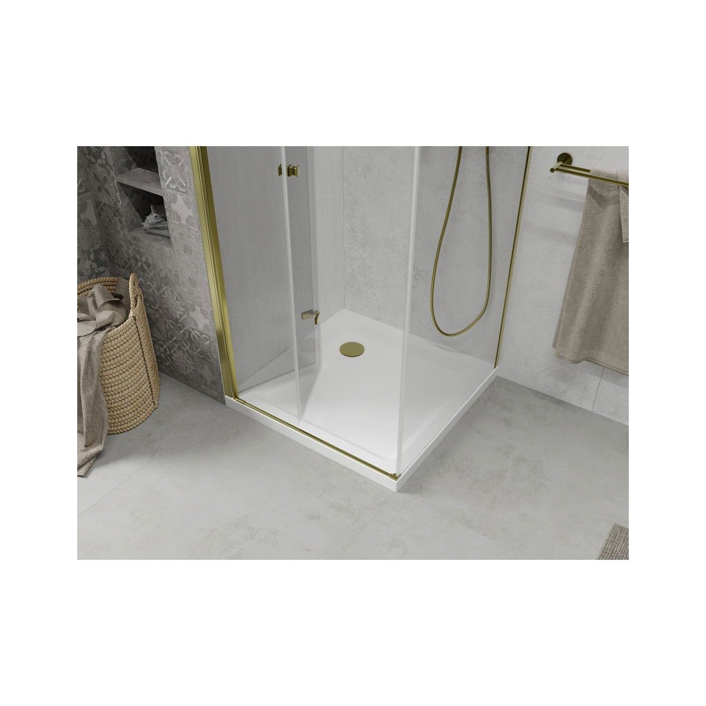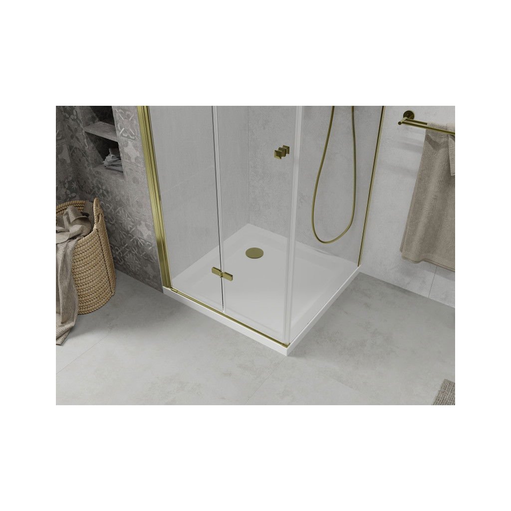 Mexen Lima zuhanykabin lehajtható ajtóval 100 x 100 cm, 6mm átlátszó üveg, arany profil + Vékony zuhanytálca, 856-100-100-50-00-4010