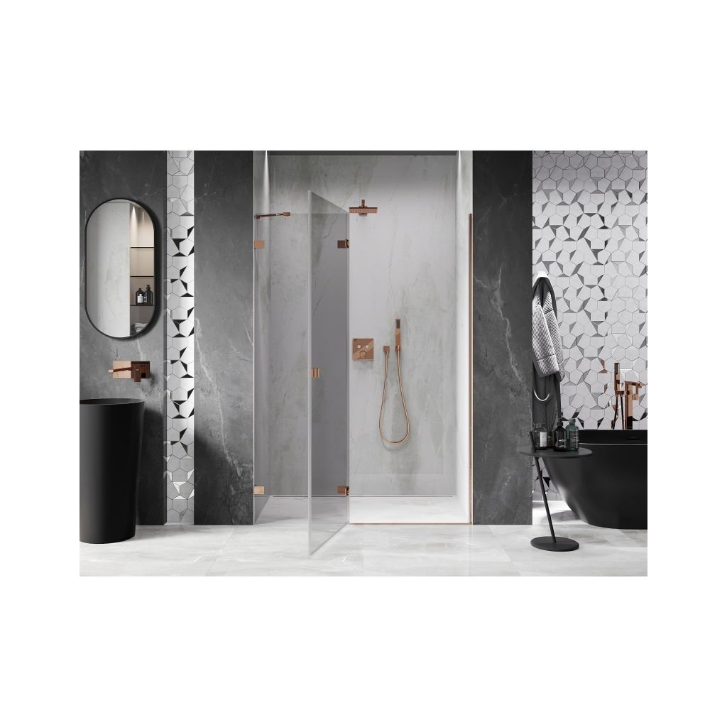 Több méretben kapható, stabil szerkezettel és csuklós ajtókkal rendelkezik. Az EasyClean felületű edzett üveg leegyszerűsíti a karbantartást, a rozéarany profil pedig modern fürdőszobákba illik.