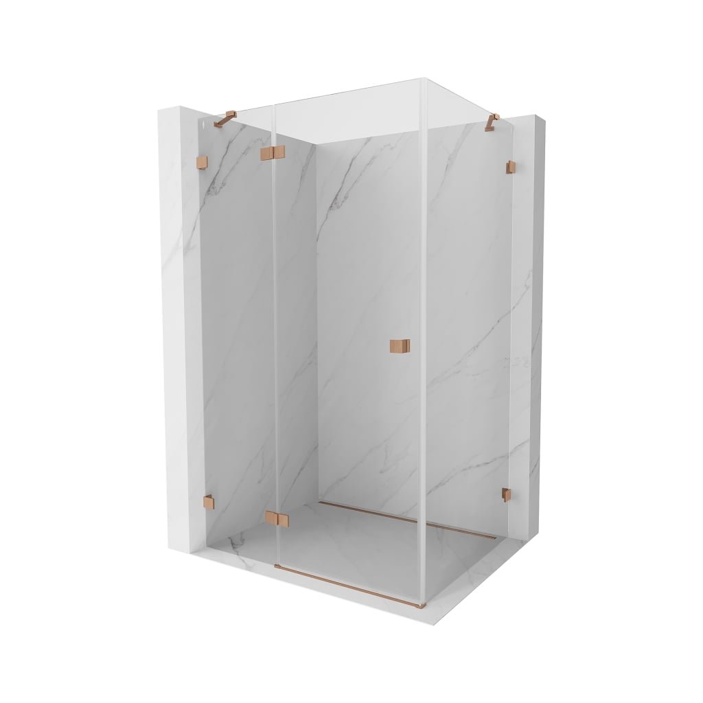 70 × 90 cm-es konfigurációban stabil szerkezetet és csuklós (szárnyas) ajtókat kínál. Az EasyClean felületű edzett üveg leegyszerűsíti a karbantartást, a szálcsiszolt réz profil pedig modern fürdőszobákba illik.