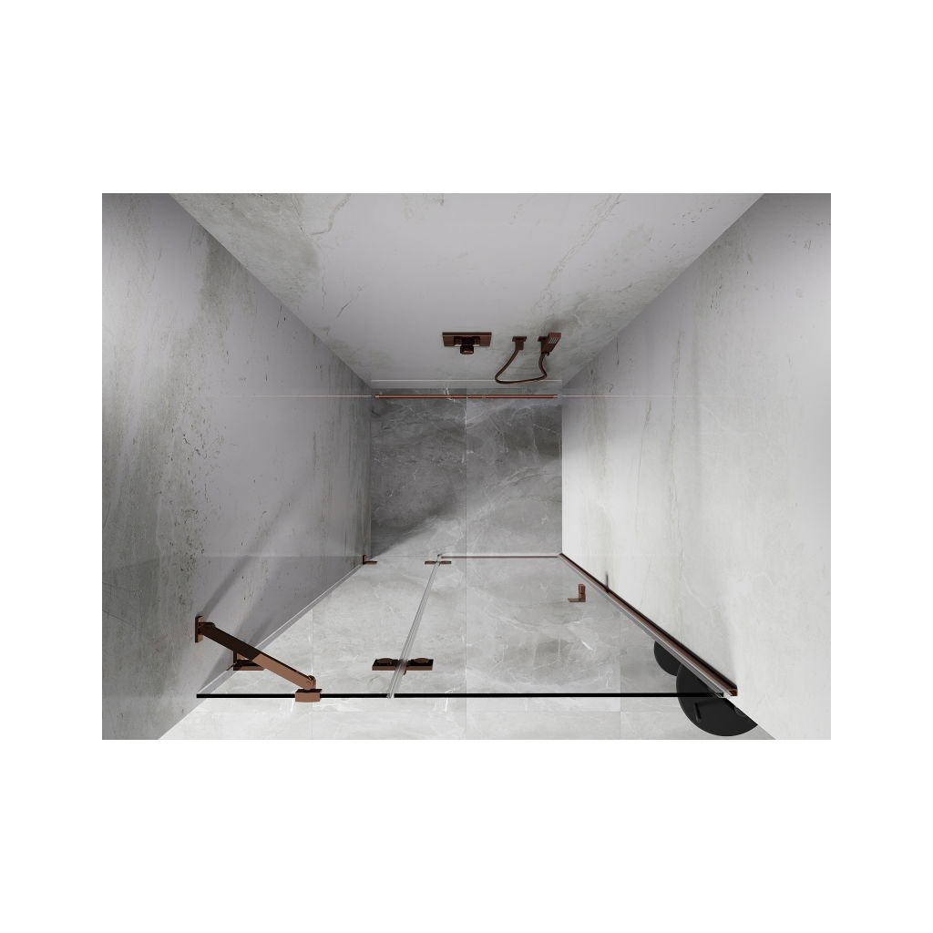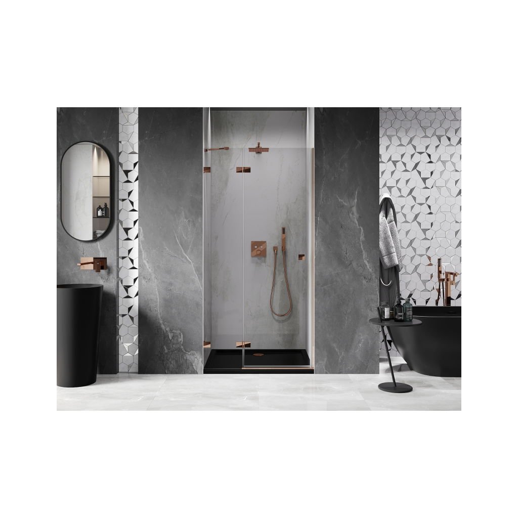 Több méretben kapható, stabil szerkezettel és csuklós ajtókkal rendelkezik. Az EasyClean felületű edzett üveg leegyszerűsíti a karbantartást, a rozéarany profil pedig modern fürdőszobákba illik.