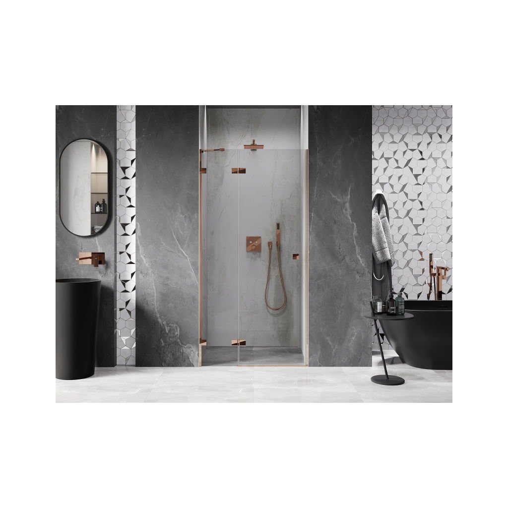 Több méretben kapható, stabil szerkezettel és csuklós ajtókkal rendelkezik. Az EasyClean felületű edzett üveg leegyszerűsíti a karbantartást, a rozéarany profil pedig modern fürdőszobákba illik.