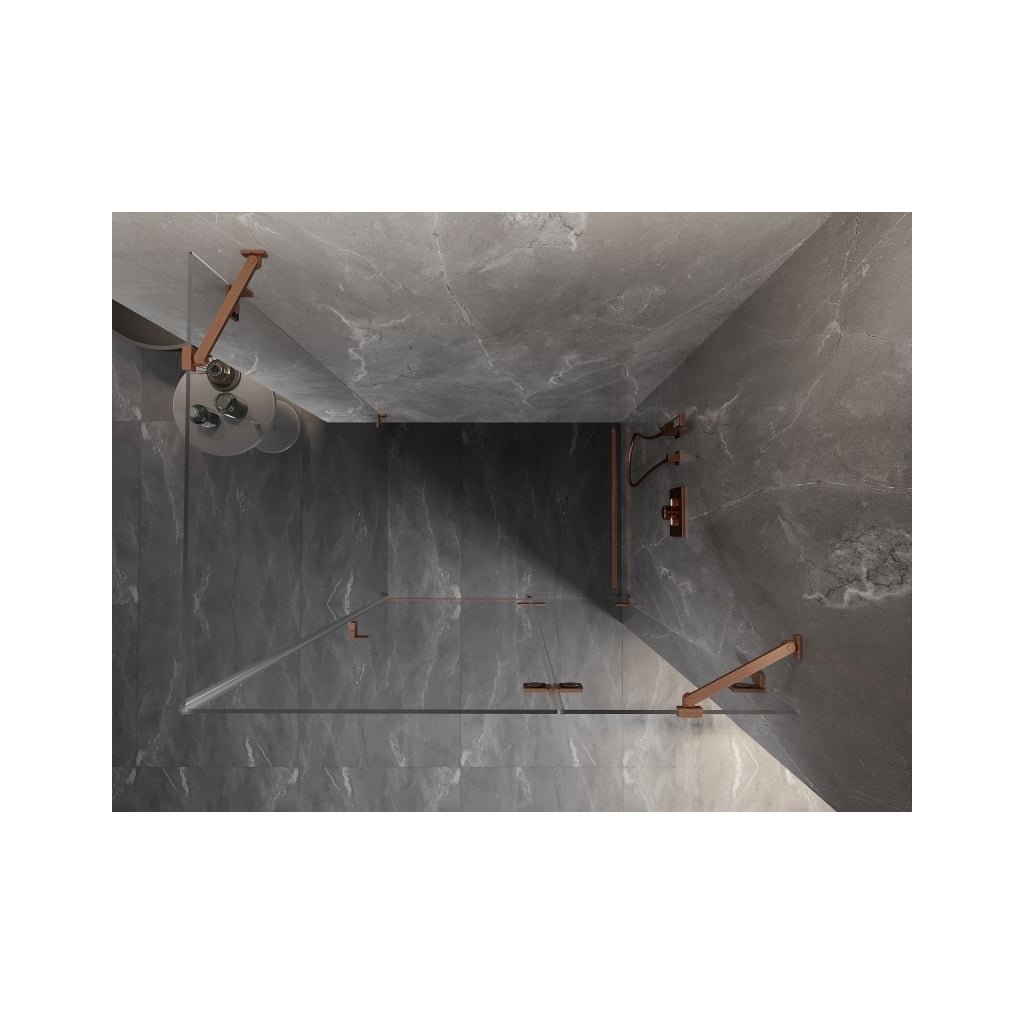 70 × 90 cm-es konfigurációban stabil szerkezetet és csuklós (szárnyas) ajtókat kínál. Az EasyClean felületű edzett üveg leegyszerűsíti a karbantartást, a szálcsiszolt réz profil pedig modern fürdőszobákba illik.