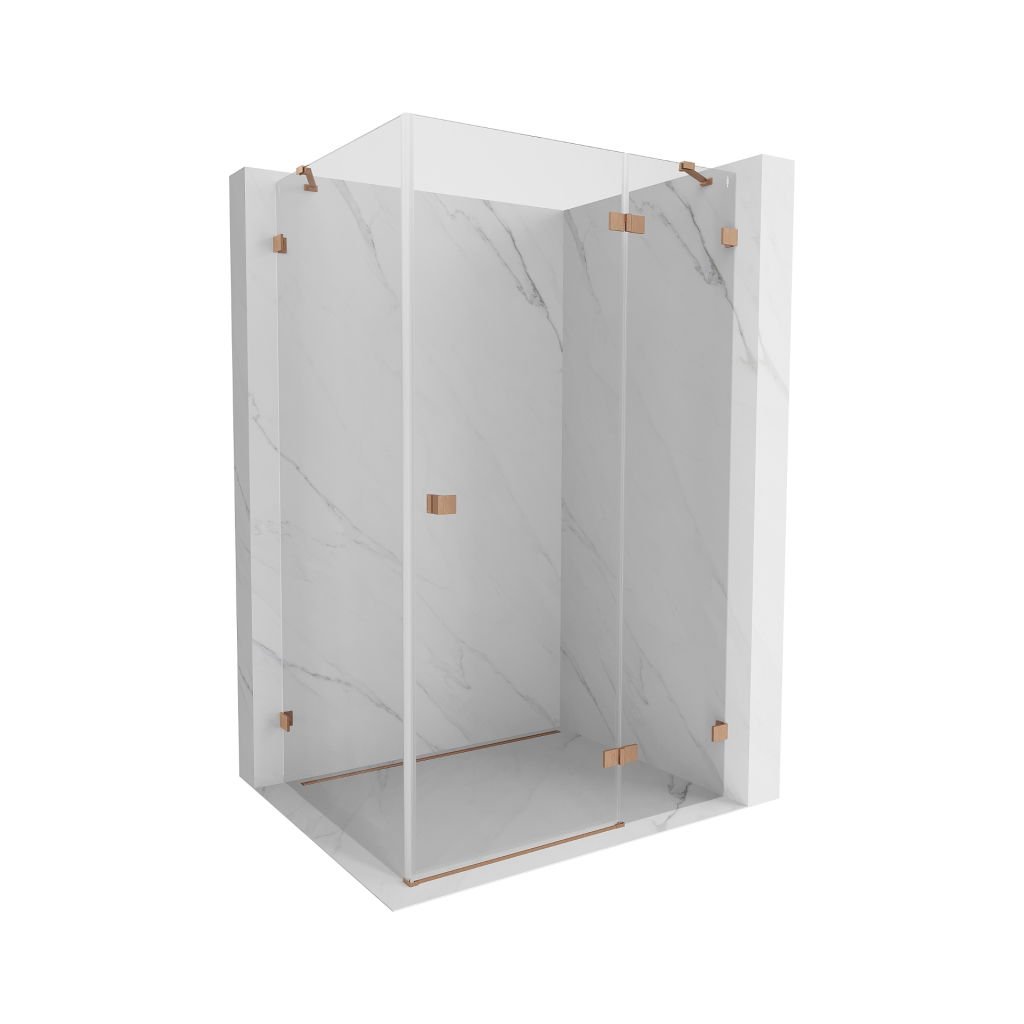 80 × 90 cm-es konfigurációban stabil szerkezetet és csuklós (szárnyas) ajtókat kínál. Az EasyClean felületű edzett üveg leegyszerűsíti a karbantartást, a szálcsiszolt réz profil pedig modern fürdőszobákba illik.