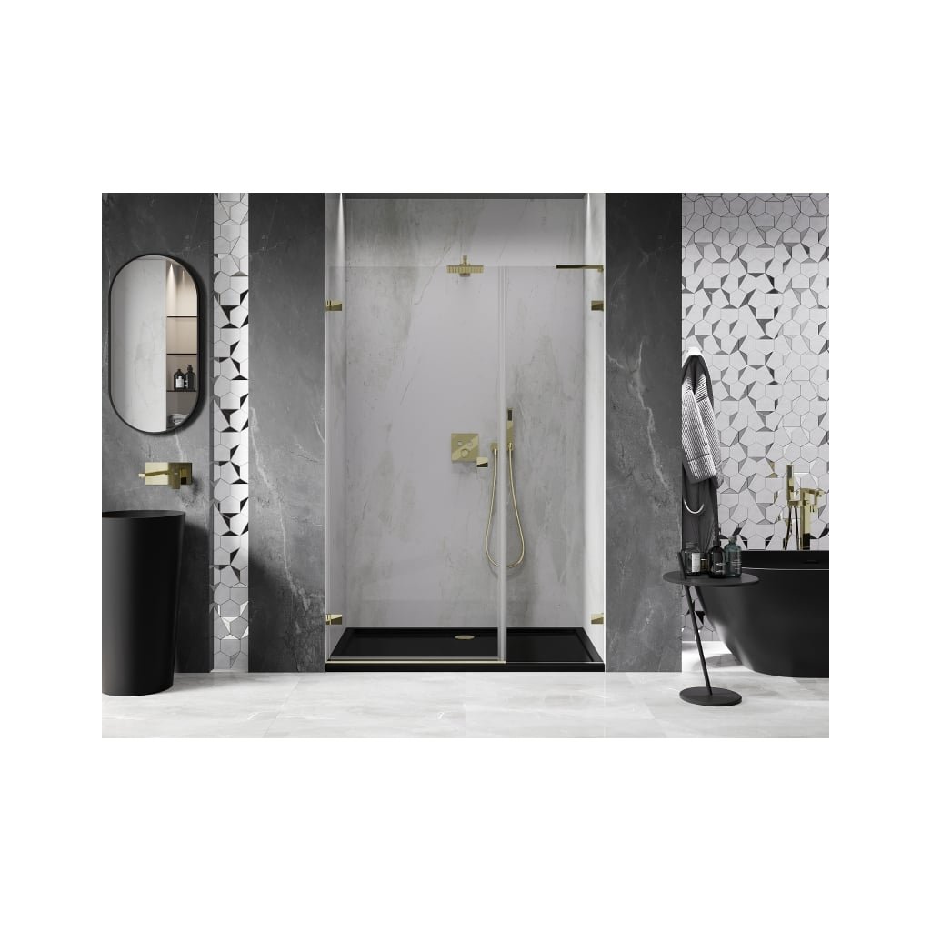 Több méretben kapható, stabil szerkezettel és csuklós ajtókkal rendelkezik. Az EasyClean felületű edzett üveg leegyszerűsíti a karbantartást, a fényes arany profil pedig modern fürdőszobákba illik.