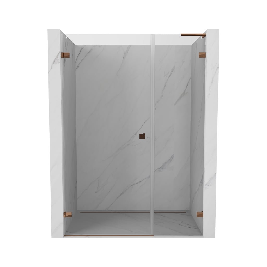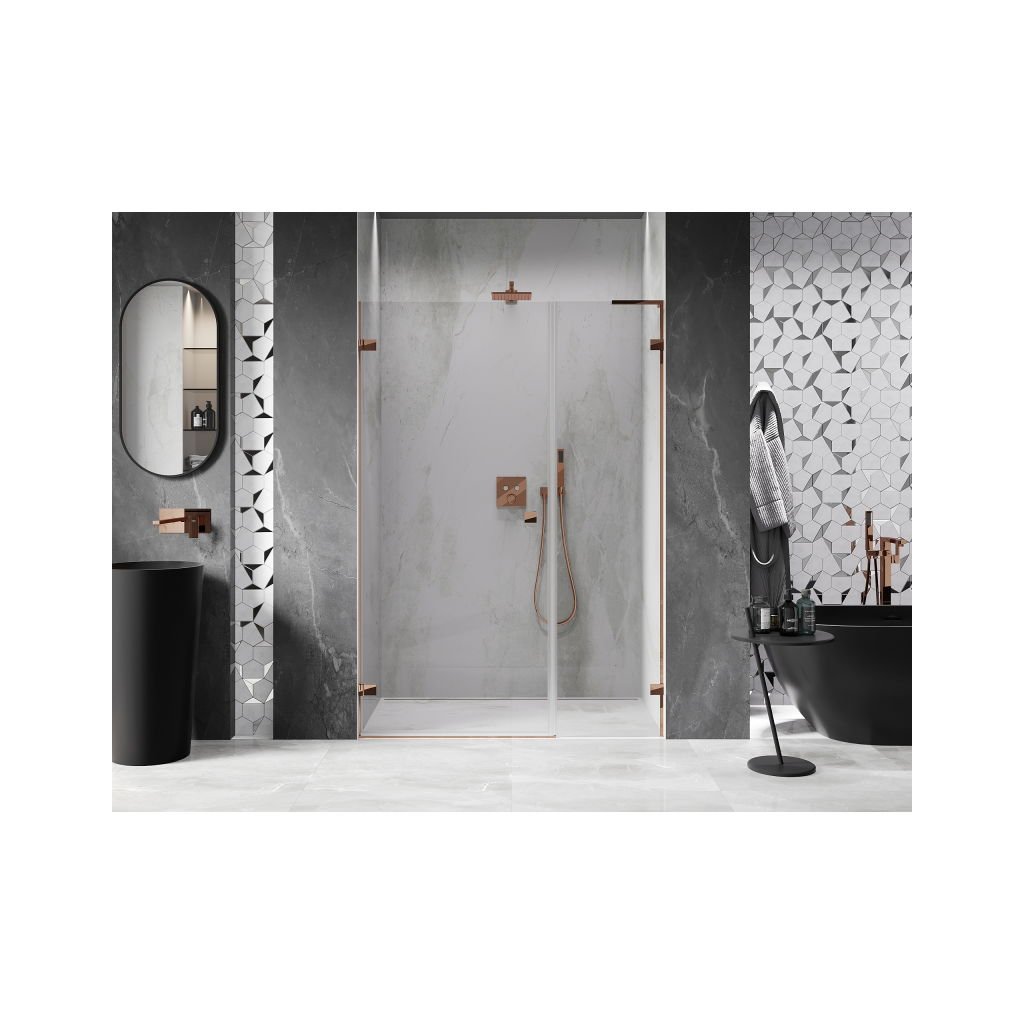 Több méretben kapható, stabil szerkezettel és csuklós ajtókkal rendelkezik. Az EasyClean felületű edzett üveg leegyszerűsíti a karbantartást, a rozéarany profil pedig modern fürdőszobákba illik.