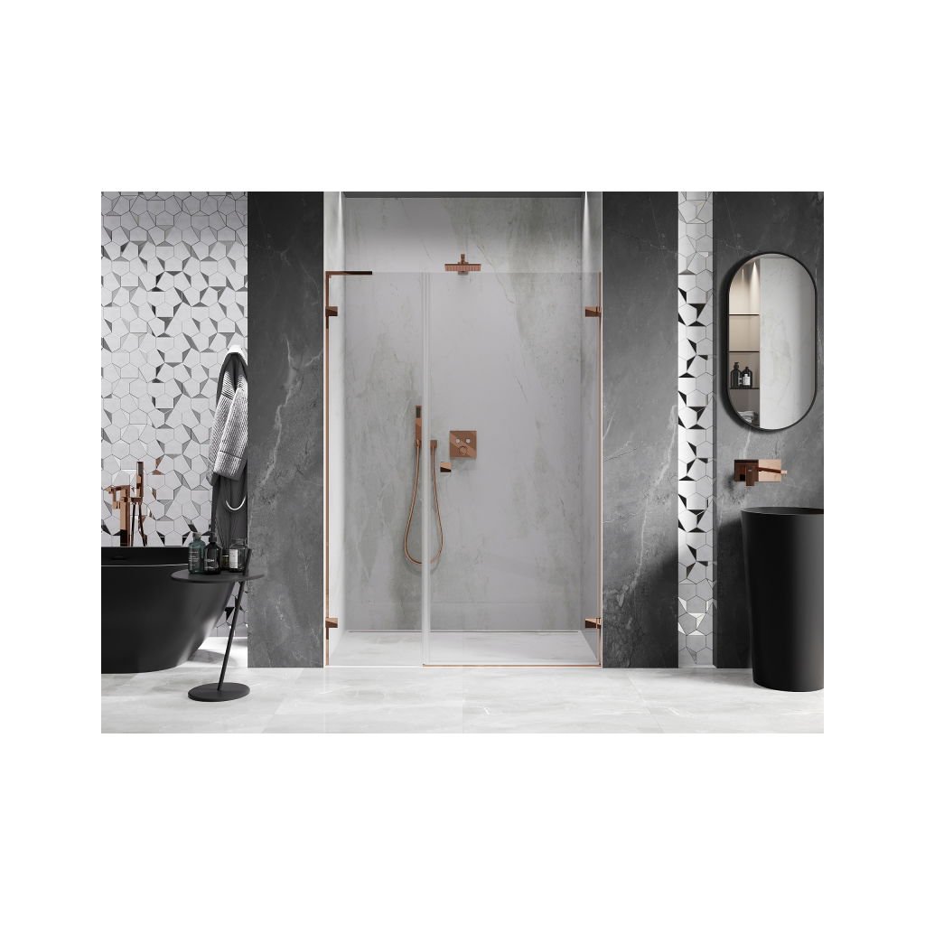 Több méretben kapható, stabil szerkezettel és csuklós ajtókkal rendelkezik. Az EasyClean felületű edzett üveg leegyszerűsíti a karbantartást, a rozéarany profil pedig modern fürdőszobákba illik.