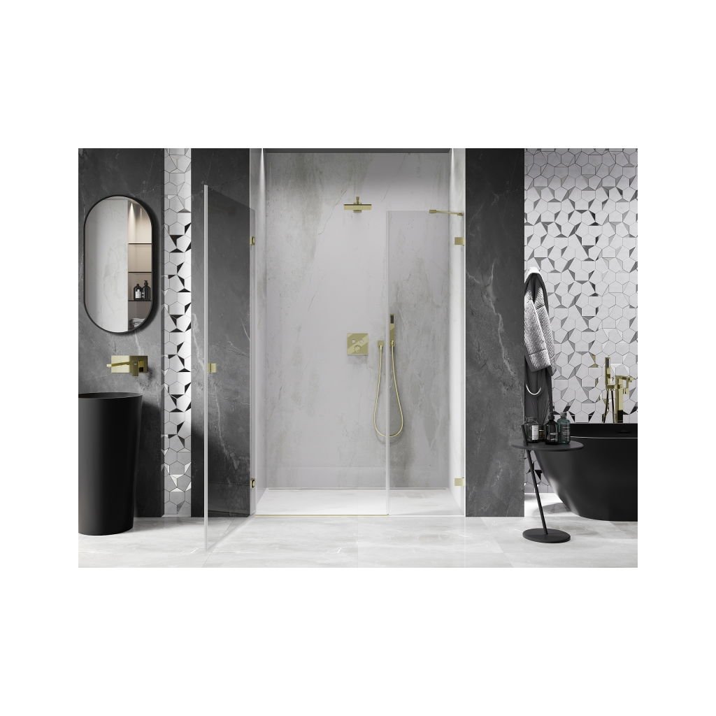 Több méretben kapható, stabil szerkezettel és csuklós ajtókkal rendelkezik. Az EasyClean felületű edzett üveg leegyszerűsíti a karbantartást, a szálcsiszolt arany profil pedig modern fürdőszobákba illik.