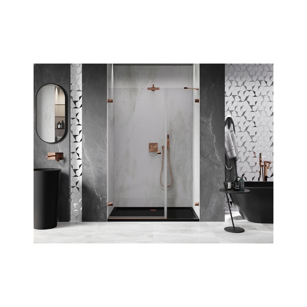 Több méretben kapható, stabil szerkezettel és csuklós ajtókkal rendelkezik. Az EasyClean felületű edzett üveg leegyszerűsíti a karbantartást, a rozéarany profil pedig modern fürdőszobákba illik.